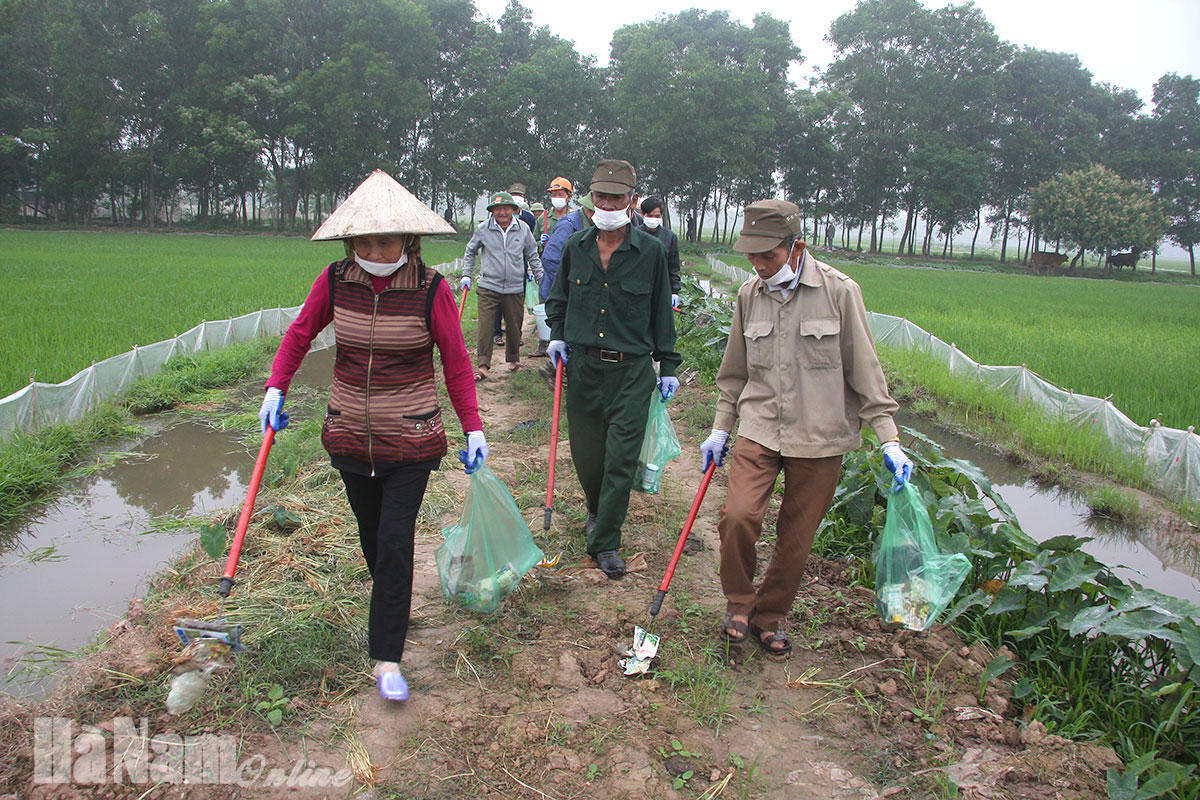 Các thành viên CLB CCB tự quản bảo vệ môi trường thôn Hòa Ngãi, xã Thanh Hà (Thanh Liêm ) thu gom vỏ thuốc BVTV tại cánh đồng xã.