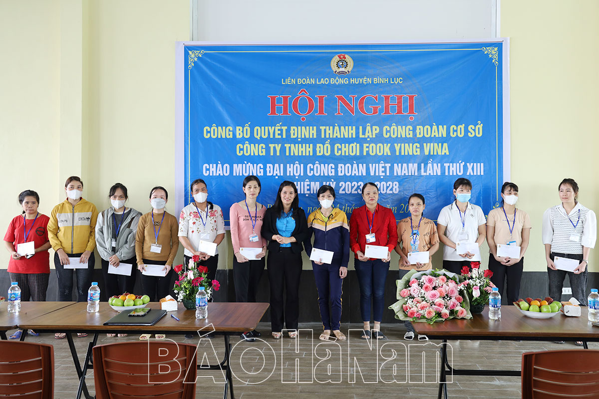 Tại hội nghị, lãnh đạo LĐLĐ huyện Bình Lục đã công bố Quyết định thành lập CĐCS Công ty TNHH đồ chơi Fook Ying Vina; kết nạp 130 đoàn viên vào tổ chức công đoàn; chỉ định 3 Ủy viên Ban Chấp hành và 3 Ủy viên Ủy ban Kiểm tra lâm thời.