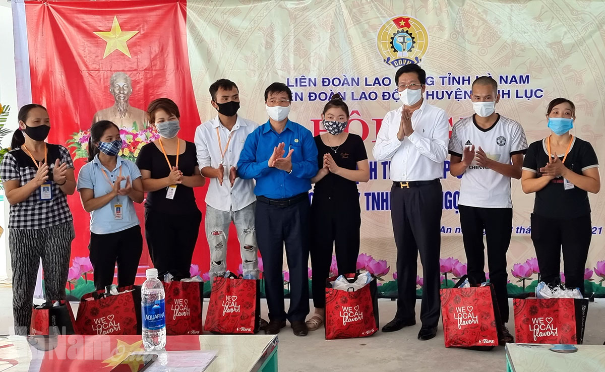 Công ty TNHH Giày Ngọc Hồng là doanh nghiệp của Đài Loan, đi vào hoạt động từ tháng 3/2021. Công ty hiện có gần 1.000 lao động, thu nhập bình quân từ 7-10 triệu đồng/người/tháng. Các chế độ, chính sách đối với người lao động được công ty thực hiện đầy đủ theo đúng quy định của pháp luật. Nhân dịp này, LĐLĐ tỉnh, LĐLĐ huyện tặng 50 suất quà cho công nhân lao động có hoàn cảnh khó khăn của Công ty TNHH Giày Ngọc Hồng. Như vậy, năm 2021, LĐLĐ huyện Bình Lục đã hoàn thành chỉ tiêu về thành lập CĐCS với tổng số 4 đơn vị, góp phần bảo vệ, chăm lo tốt hơn đời sống người lao động.