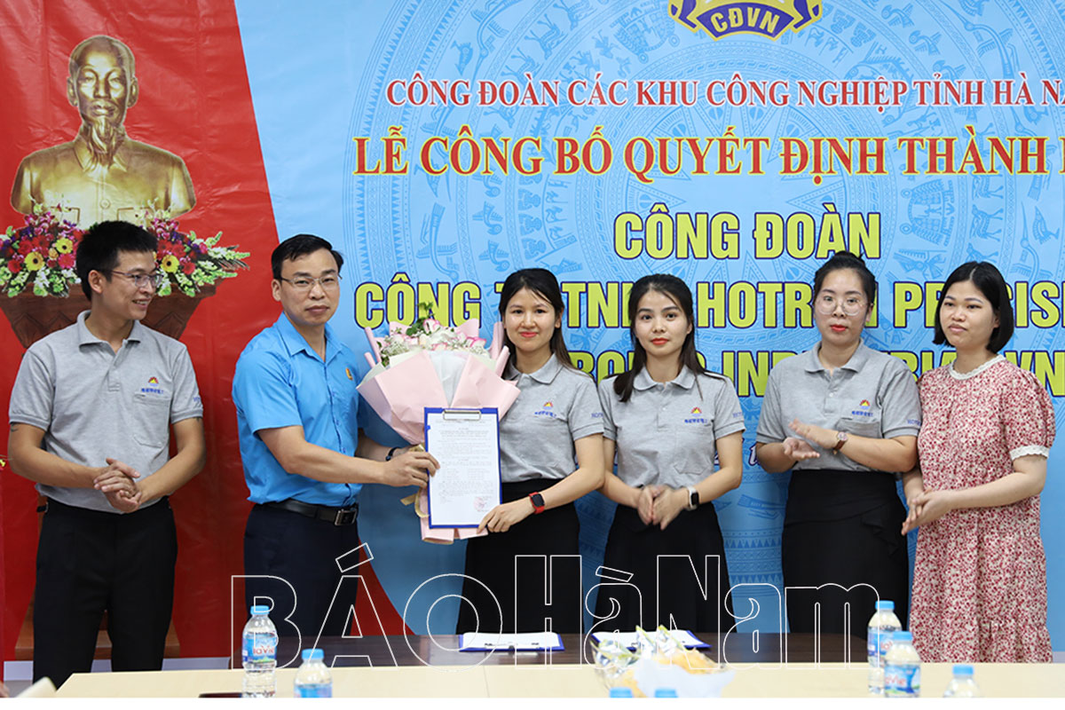 Chiều 27/6, Công đoàn các khu công nghiệp (KCN) tỉnh tổ chức hội nghị công bố quyết định thành lập công đoàn cơ sở (CĐCS) Công ty TNHH Hotron Precision Electronic Industrial Việt Nam, KCN Đồng Văn IV (huyện Kim Bảng). Lãnh đạo Liên đoàn Lao động tỉnh, đại diện lãnh đạo doanh nghiêp đã tới dự.