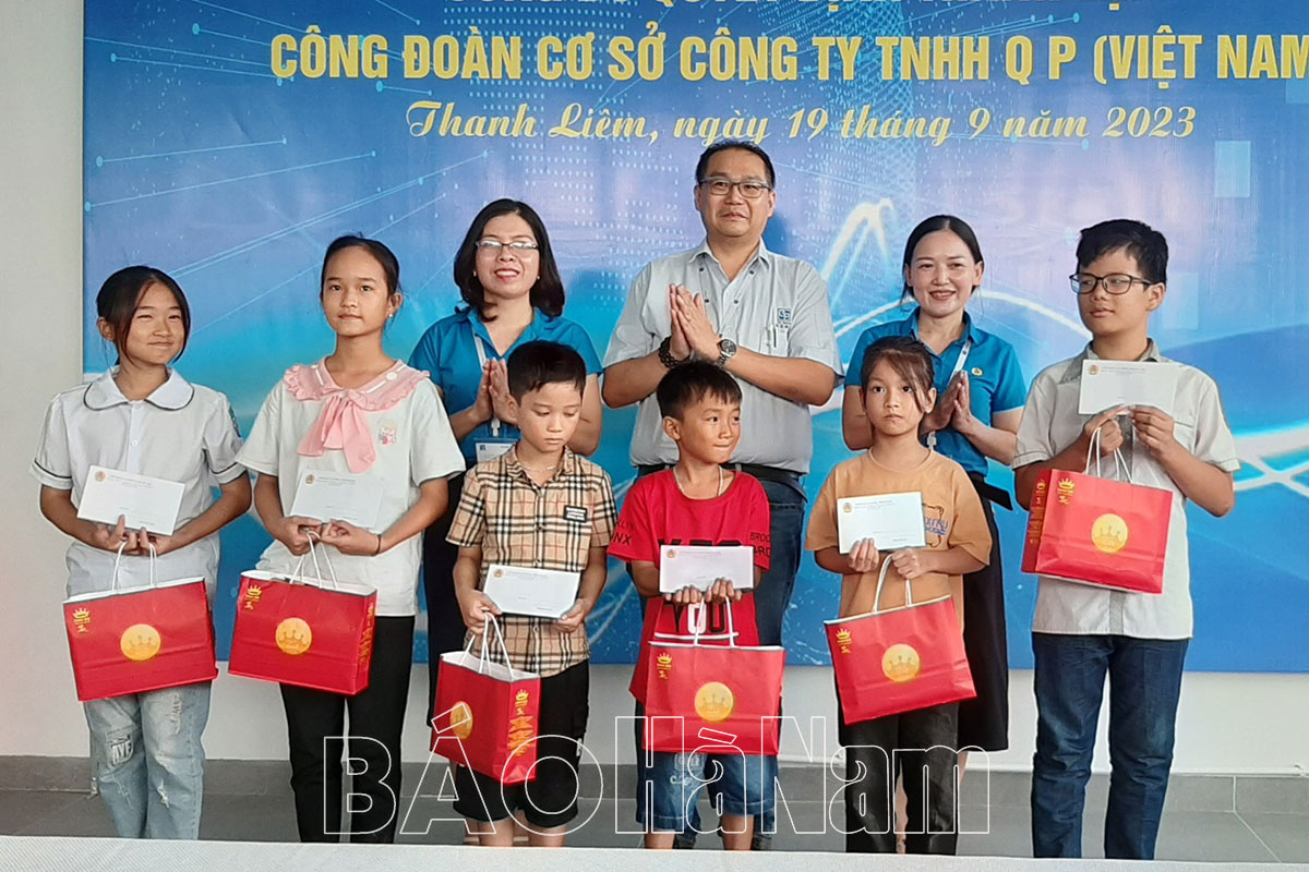Nhân dịp này, LĐLĐ huyện Thanh Liêm đã tặng 20 suất quà cho con công nhân lao động của Công ty TNHH Q P Việt Nam đạt thành tích cao, vượt khó học giỏi năm học 2022-2023, trị giá 500.000 đồng/suất. Lãnh đạo doanh nghiệp cũng dành tặng mỗi cháu một phần quà trung thu.