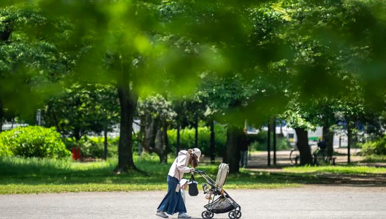 Một người phụ nữ đang đẩy con đi dạo ngoài công viên. Ảnh: AFP