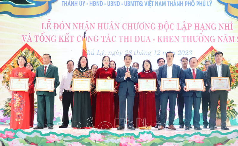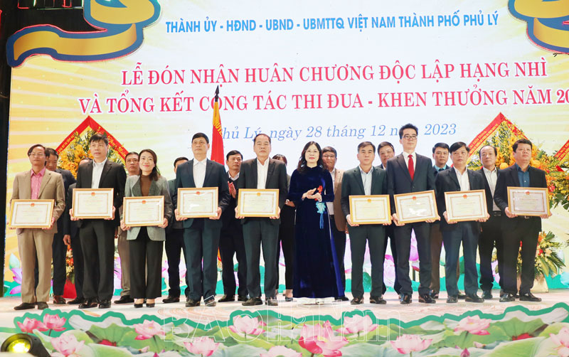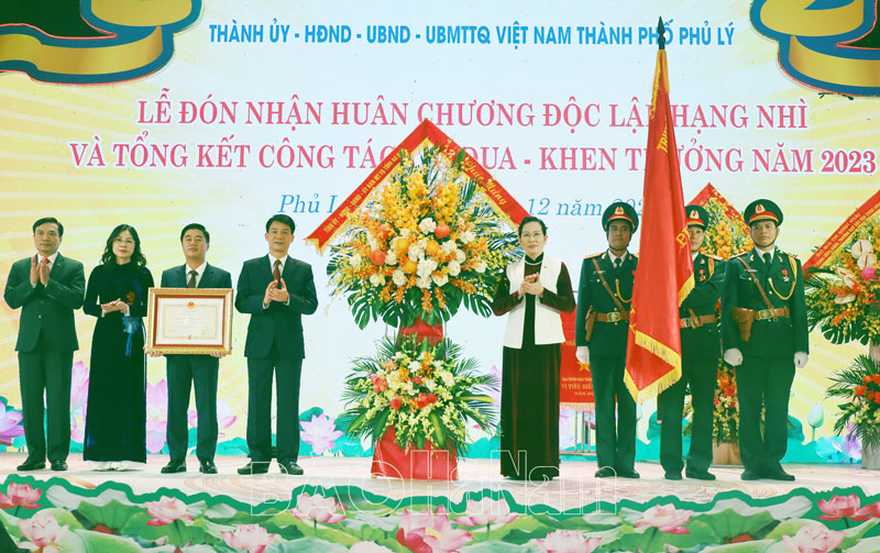 Tại Lễ đón nhận Huân chương, thừa ủy quyền của Chủ tịch nước, đồng chí Bí thư Tỉnh ủy Lê Thị Thủy đã trao Huân chương Độc lập hạng Nhì cho Đảng bộ, chính quyền và nhân dân thành phố Phủ Lý.