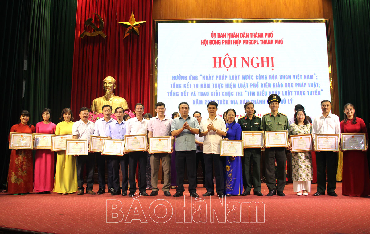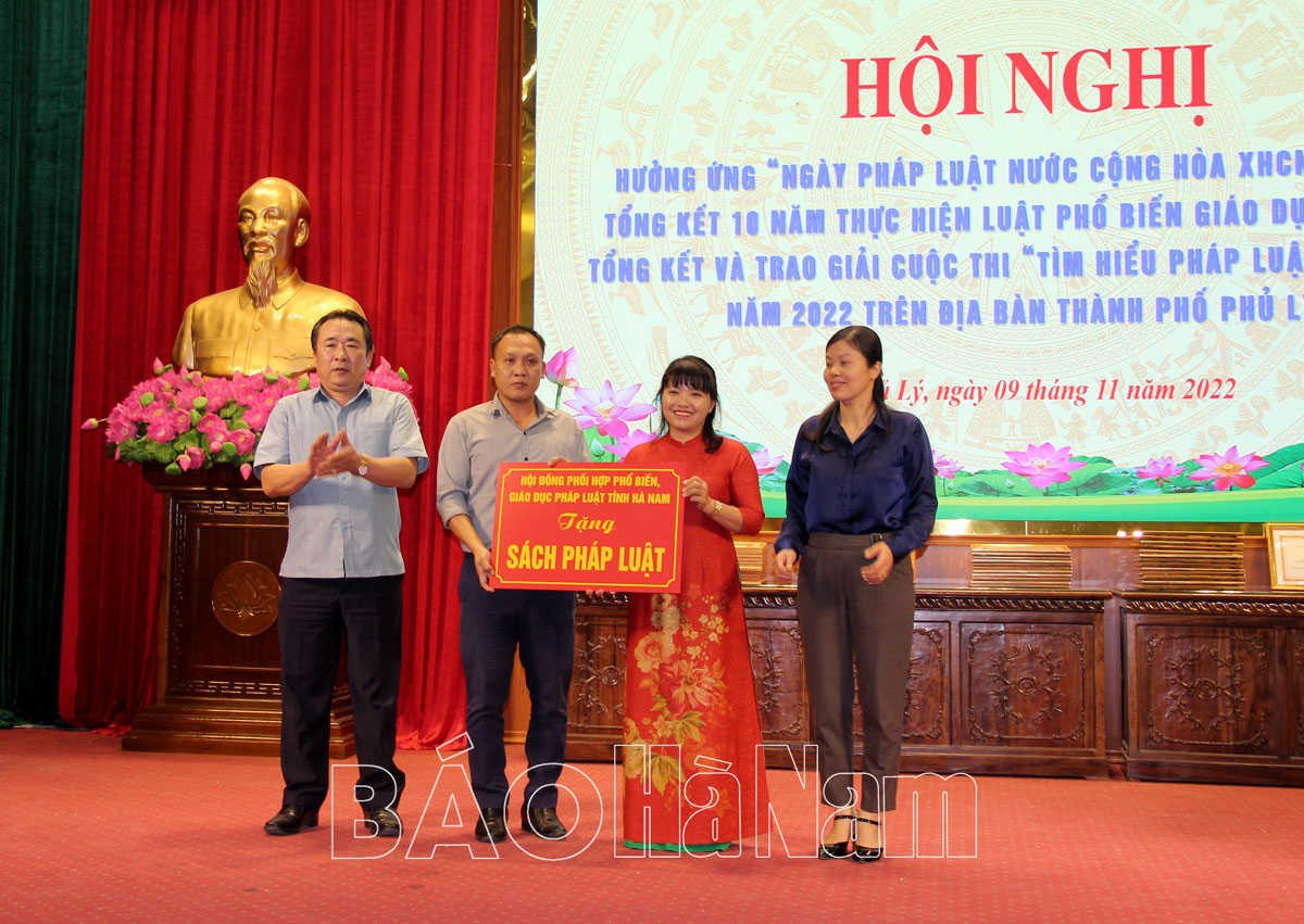 Cũng trong dịp này, Hội đồng phối hợp PBGDPL tỉnh, UBND thành phố Phủ Lý đã trao tặng sách pháp luật cho các nhà trường, các địa phương đăng ký xây dựng nông thôn mới kiểu mẫu; trao tặng Giấy khen cho các tập thể, cá nhân đạt thành tích xuất sắc trong 10 năm thực hiện Luật PBGDPL và tổ chức tổng kết và trao giải cuộc thi “Tìm hiểu pháp luật trực tuyến năm 2022”. Cuộc thi được tổ chức thành 2 đợt thi trực tuyến tìm hiểu pháp luật về Luật Đất đai 2013 và các quy định về quản lý đô thị. Qua 2 đợt thi có tổng số 8.026 người tham gia dự thi trực tuyến (đợt 1 có 2.854 người, đợt 2 có 5.172 người tham gia).