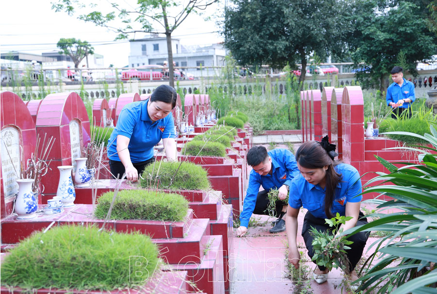 Cán bộ, đoàn viên thanh niên các đơn vị dọn cỏ tại Nghĩa trang Liệt sỹ phường Lê Hồng Phong - Châu Sơn.