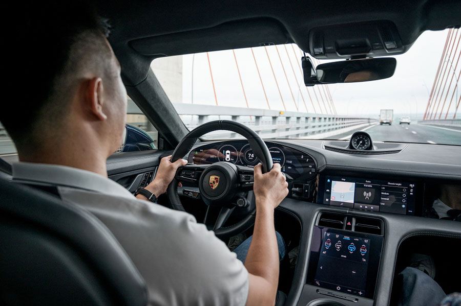 Vô-lăng chiếc Porsche Taycan. Ảnh: Minh Quân