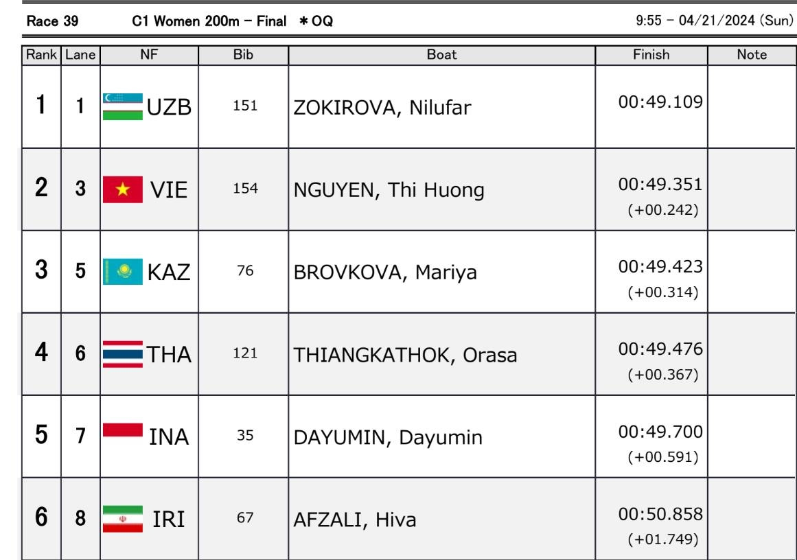 | Bảng thành tích vòng loại Olympic Paris khu vực châu Á nội dung thuyền đơn nữ C1 200m môn Canoeing. |
