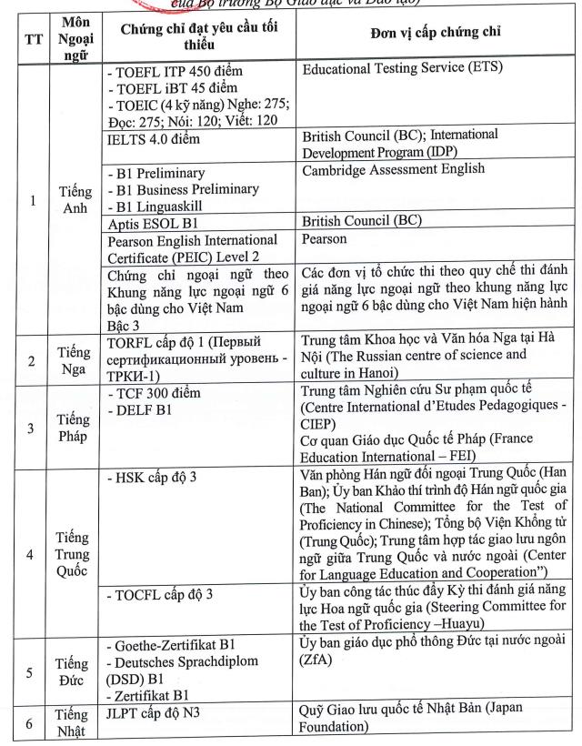 Theo đó, ngoài TOEFL ITP 450 điểm, TOEFL iBT 45 điểm, IELTS 4.0 như những năm trước, thí sinh sẽ được tính 10 điểm và miễn thi môn tiếng Anh nếu có một trong các chứng chỉ sau: B1 Preliminary, B1 Business Preliminary, B1 Linguaskill; Aptis ESOL B1; Pearson English International Certificate (PEIC) level 2; TOEIC 4 kỹ năng (Nghe và Đọc 275, Nói và Viết 120); chứng chỉ bậc 3 theo khung năng lực ngoại ngữ 6 bậc dùng cho Việt Nam (VSTEP).