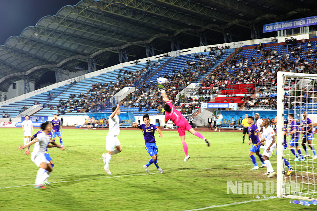 Thủ môn đội khách Hà Nội FC nỗ lực cản phá pha bóng tấn công của đội chủ sân Thiên Trường.