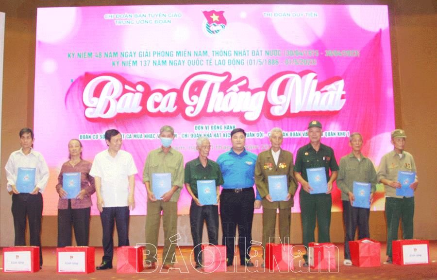 Cũng tại chương trình Ban tổ chức đã trao 90 suất quà cho các đồng chí thương binh, cựu thanh niên xung phong, hộ nghèo có hoàn cảnh khó khăn, học sinh nghèo vượt khó; tặng 300 tài khoản thiết kế ấn phẩm tuyên truyền các hoạt động của Đoàn(CanvaPro) cho Tỉnh đoàn, 1 tài khoản sử dụng 02 năm trị giá 2,6 triệu đồng; tặng Website thông tin điện tử cho Thị đoàn Duy Tiên trị giá 30 triệu đồng; trao tủ sách thiếu nhi cho Hội đồng đội thị xã Duy Tiên với 200 đầu sách,