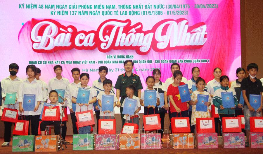 Chương trình nghệ thuật “ Bài ca thống nhất” được tổ chức bởi sự kết hợp của Đoàn cơ sở Nhà hát ca múa nhạc Việt Nam; Chi đoàn Nhà hát Kịch nói Quân đội; Chi đoàn Đoàn văn công Quân khu 1; Đoàn Thanh niên Công ty Cổ phần Chứng khoán Ngân hàng Công thương Việt Nam. Chương trình nghệ thuật “Bài ca thống nhất” là một bức tranh đẹp phác họa về một thời hào hùng của dân tộc bằng những tác phẩm đã sống cùng năm tháng, được các nghệ sĩ thể hiện.