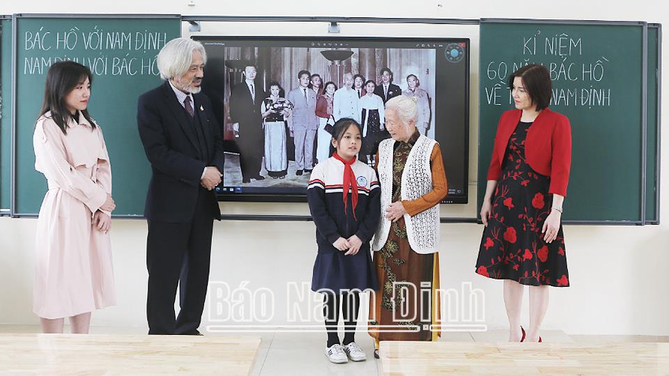 | Bà Vũ Thị Bích Liên kể chuyện với cô và trò Trường Tiểu học Nguyễn Tất Thành về kỷ niệm 2 lần bà vinh dự được gặp Bác Hồ. |