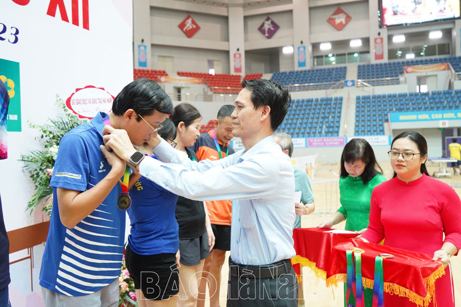 Đồng chí Lê Hồng Kỳ, TUV, Tổng Biên tập Báo Hà Nam, Chủ tịch Hội Nhà báo tỉnh trao huy chương cho các VĐV đạt thành tích cao nội dung đôi nam nữ khối vô địch.