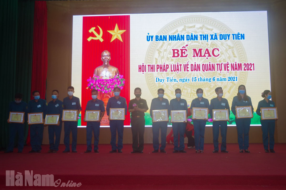 Tham dự hội thi, những cán bộ chính trị viên, chỉ huy trưởng, phó chỉ huy trưởng các xã, phường trên địa bàn thị xã đã trải qua các phần thi chung và phần thi riêng cho từng đối tượng. Phần thi chung (áp dụng với tất cả thí sinh) gồm các nội dung: nhận thức pháp luật về DQTV (bằng phương pháp trắc nghiệm); bắn súng ngắn K54 bài 1c. Phần thi riêng (áp dụng với từng đối tượng). Theo đó, chỉ huy trưởng ban CHQS cấp xã thi nội dung: tham mưu xây dựng và báo cáo kế hoạch “Tổ chức lực lượng, huấn luyện, hoạt động và bảo đảm chế độ, chính sách cho dân quân giai đoạn 2021-2025 của xã (phường) theo quy định của Luật DQTV năm 2019 và các văn bản quy định chi tiết thi hành luật”; Chính trị viên ban CHQS cấp xã thi nội dung chuẩn bị giáo án và thực hành lên lớp 1 chuyên đề giáo dục chính trị, pháp luật cho dân quân; Phó chỉ huy trưởng ban CHQS cấp xã thi nội dung: tham mưu xây dựng và báo cáo kế hoạch huấn luyện cho lực lượng dân quân của cấp xã. Với sự chủ động, tích cực trong chỉ đạo cũng như nỗ lực, quyết tâm của các lực lượng dự thi, hội thi pháp luật về DQTV của thị xã Duy Tiên đã thành công tốt đẹp, đạt mục đích, yêu cầu đề ra, bảo đảm an toàn tuyệt đối. Các thí sinh hoàn thành tốt nội dung dự thi, thể hiện tốt từng phần thi bảo đảm chặt chẽ, nghiêm túc, nhất là nội dung thi: giảng bài chính trị, báo cáo kế hoạch và bắn súng ngắn K54. Kết quả hội thi: 56,5% thí sinh đạt khá, giỏi; 43,5% thí sinh đạt yêu cầu. Ban tổ chức đã trao giải nhất tập thể cho Ban CHQS xã Yên Nam; giải nhì tập thể cho Ban CHQS phường Duy Minh; giải ba tập thể cho Ban CHQS xã Tiên Sơn; giải khuyến khích cho Ban CHQS các xã Chuyên Ngoại, Mộc Nam. Với từng nội dung thi, Ban tổ chức cũng đã trao giải nhất, nhì, ba, khuyến khích cho các cá nhân có thành tích xuất sắc; đồng thời lựa chọn những cá nhân tiêu biểu tham gia hội thi pháp luật về DQTV do cấp trên tổ chức.