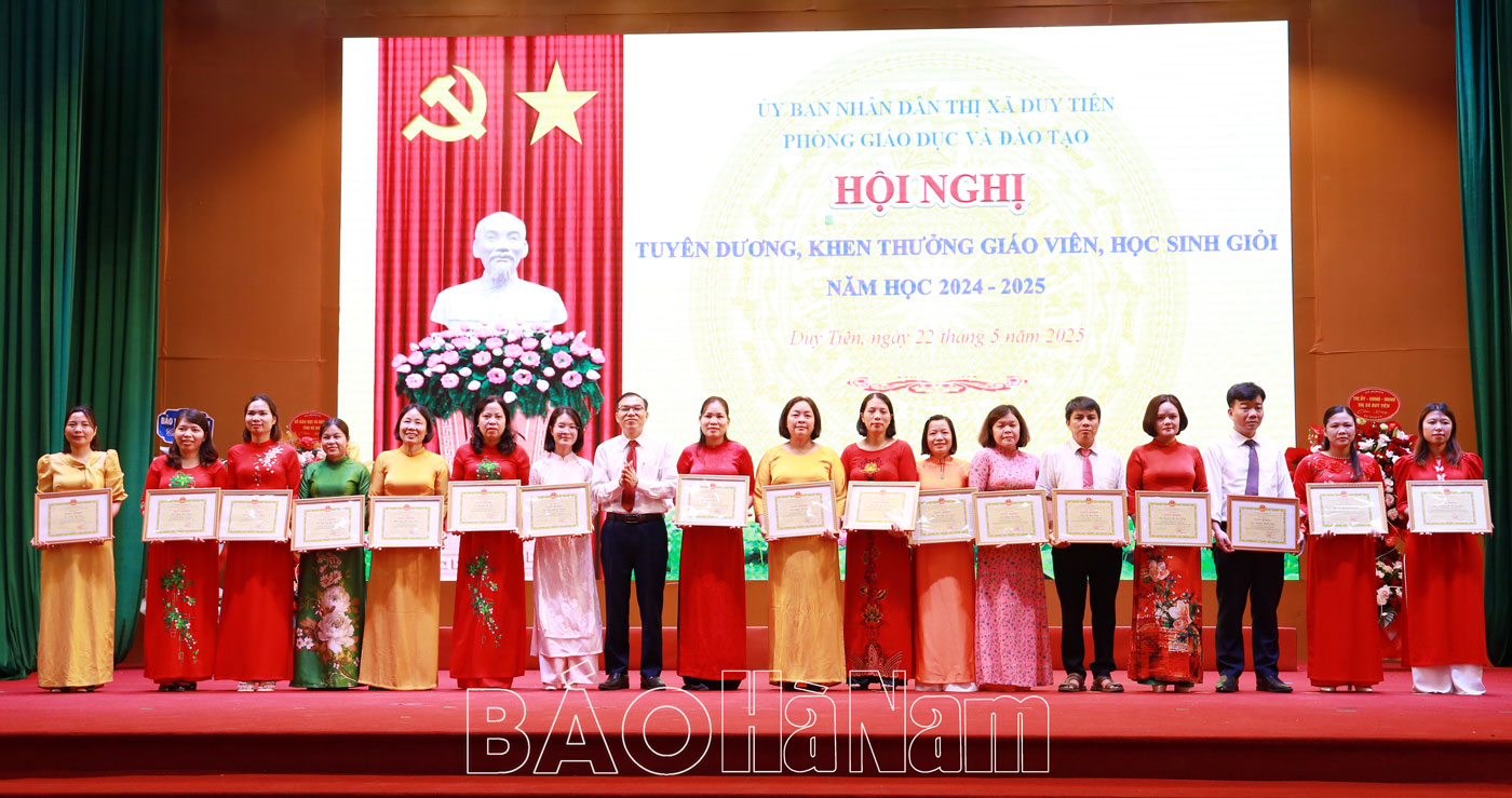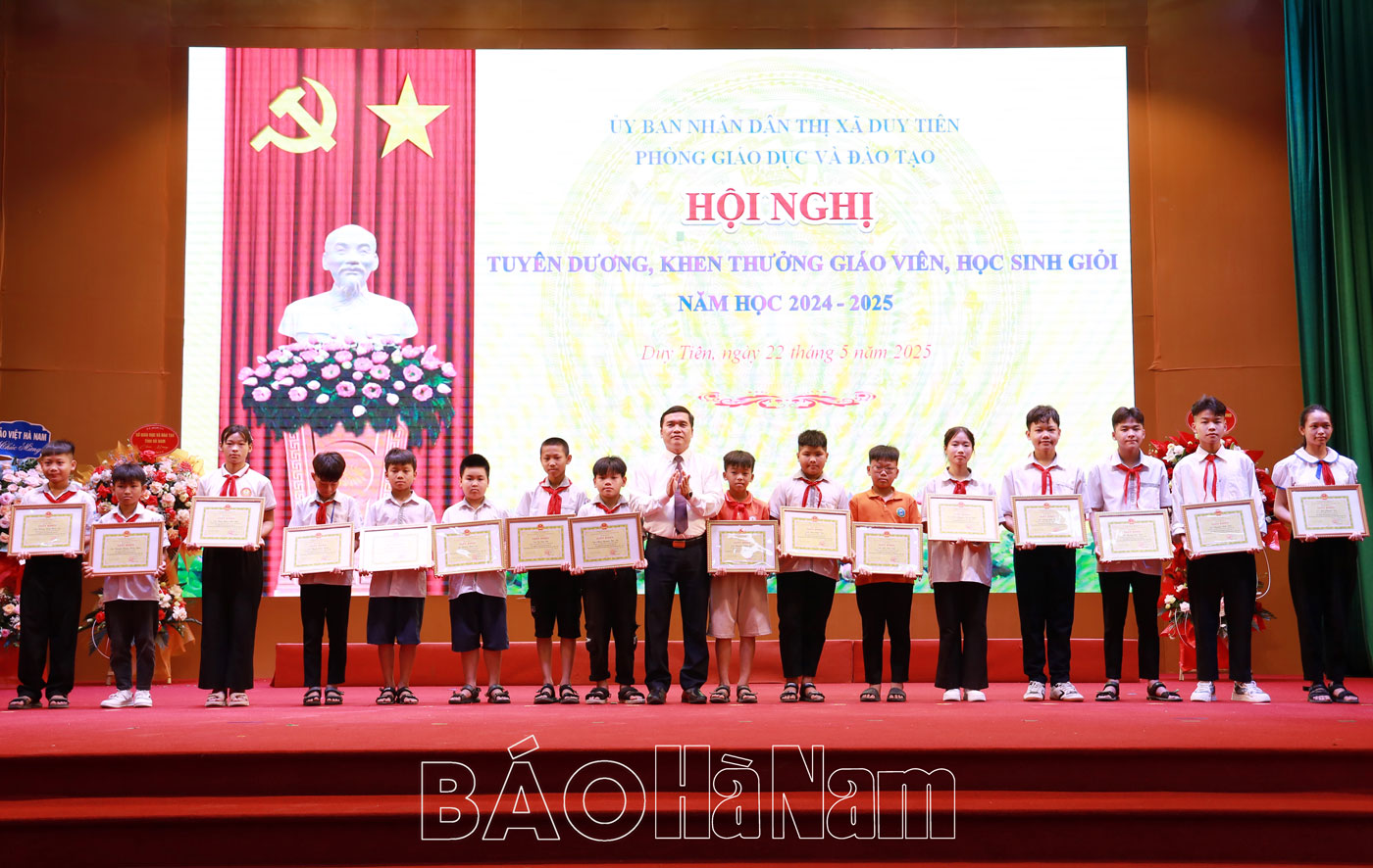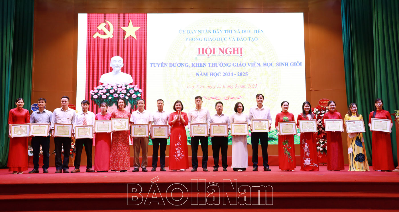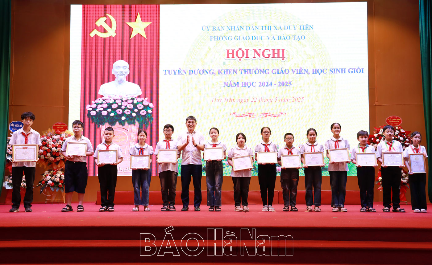 Chiều 22/5, Phòng Giáo dục và Đào tạo (GD&ĐT) thị xã Duy Tiên tổ chức hội nghị tuyên dương, khen thưởng giáo viên, học sinh giỏi năm học 2024 - 2025. Dự hội nghị có đồng chí Nguyễn Văn Lượng, Ủy viên Ban Thường vụ Tỉnh ủy, Bí thư Thị ủy Duy Tiên; lãnh đạo Sở GD&ĐT; thị xã Duy Tiên cùng các giáo viên, học sinh được khen thưởng.