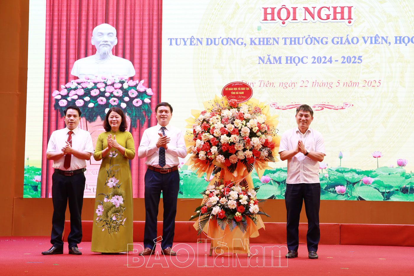 Đồng chí Nguyễn Văn Lượng, Ủy viên BTV Tỉnh ủy, Bí thư Thị ủy Duy Tiên trao khen thưởng cho các em học sinh. Lãnh đạo Sở GD&ĐT trao khen thưởng cho các em học sinh.