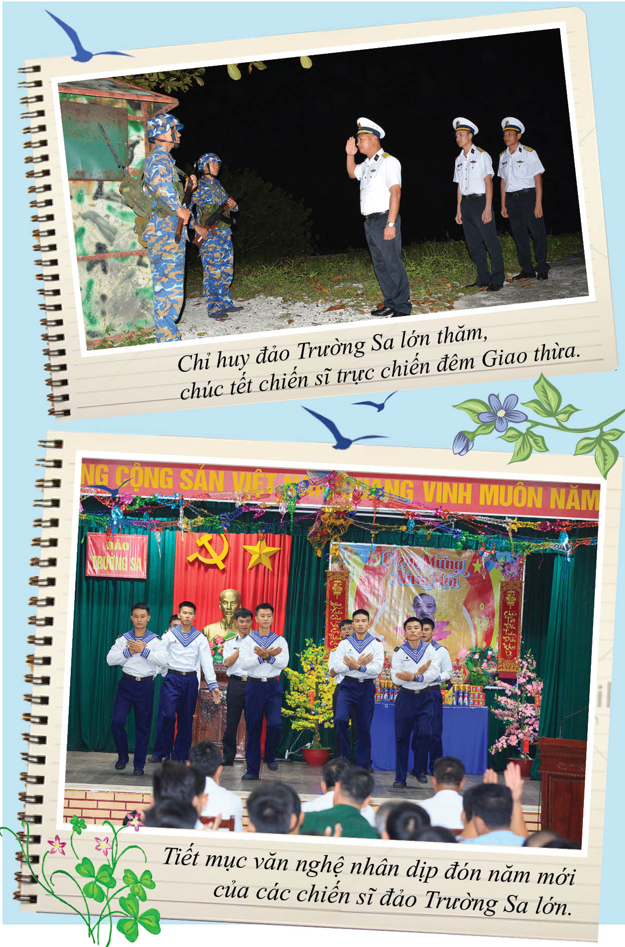 Sau hải trình gần 2 ngày đêm, tàu 561 chở đoàn công tác đến Đảo Trường Sa Lớn. Nhờ có âu tàu lớn nên việc vận chuyển quà Tết lên đảo có nhiều thuận lợi. Khi lên đến đảo, tất cả mệt mỏi, âu lo của các thành viên đoàn công tác đều tan biến, thay vào đó là không khí khẩn trương, hân hoan của cán bộ, chiến sĩ trên đảo... Các kíp phóng viên nhanh chóng tỏa ra tác nghiệp. Trước mắt chúng tôi là một Trường Sa xanh biếc với không khí xuân rộn ràng. “Tàu ra, Trường Sa vào Tết” - đó là câu nói của những người lính đảo khi thấy tàu cập bến. Những cành mai, cây quất vừa ở trên tàu vận chuyển xuống đảo được đưa lên chậu ngay ngắn. Các hoạt động chuẩn bị trang trí Tết, đón Xuân được triển khai. Hầu hết quân và dân trên đảo cùng nhau gói bánh chưng, trang trí bàn thờ Bác Hồ. Đặc biệt, ngoài gói bánh chưng bằng lá dong, một “đặc sản” ngày tết ở Trường Sa là bánh chưng gói bằng lá bàng vuông. Bánh chưng gói lá bàng vuông không chỉ đặc biệt bởi vị chát ngọt của lá mà còn mang hương vị mặn mòi của biển. Thượng tá Phạm Thế Nhương, Chỉ huy trưởng Đảo Trường Sa lớn, Chủ tịch UBND thị trấn Trường Sa cho biết: “Cùng với nhiệm vụ sẵn sàng chiến đấu, cấp ủy, chỉ huy đảo còn tổ chức nhiều hoạt động thu hút đông đảo cán bộ chiến sĩ, nhân dân tham gia. Đêm Giao thừa, sau lễ đón năm mới, Ban chỉ huy đảo chúc tết cán bộ chiến sĩ đang làm nhiệm vụ các điểm gác, trực chiến đấu. Sáng mùng một Tết, cán bộ, chiến sĩ và nhân dân trên đảo đến thắp hương tại Đài tưởng niệm Liệt sĩ, Nhà tưởng niệm Chủ tịch Hồ Chí Minh. Sau đó, các gia đình và cán bộ, chiến sĩ trên đảo tổ chức thành từng nhóm đi thắp hương ở chùa và liên hoan, chúc Tết với các đơn vị, đồng hương trên đảo”. Ngay buổi tối đầu tiên trên đảo, chúng tôi đã được hòa mình vào không khí Xuân rộn ràng. Đoàn công tác cùng các chiến sĩ trên đảo tổ chức đêm văn nghệ với những bài ca về tình yêu đất nước, yêu biển đảo quê hương.