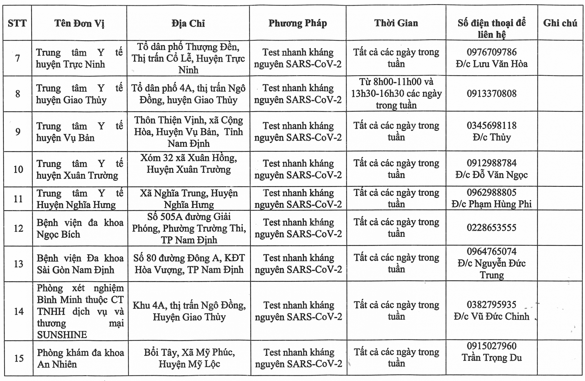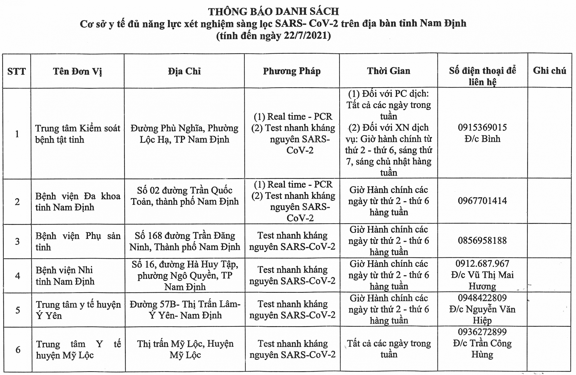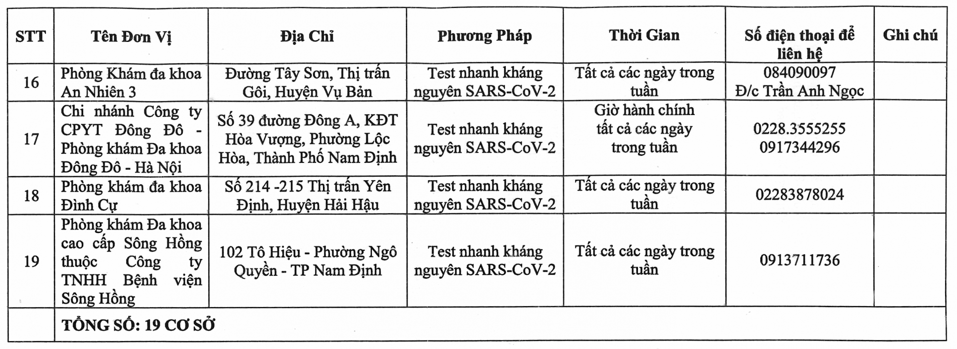 Thông báo danh sách cơ sở y tế đủ năng lực xét nghiệm sàng lọc SARS- CoV- 2 trên địa bàn tỉnh Nam Định (tính đến ngày 22-7-2021)