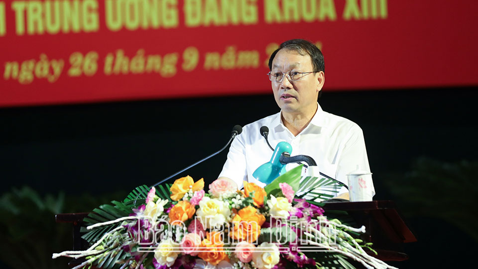 | Đồng chí Phó Bí thư Thường trực Tỉnh ủy Lê Quốc Chỉnh quán triệt nội dung hội nghị. |