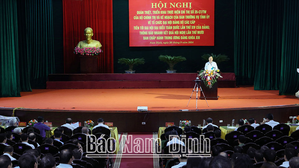Đồng chí Phó Bí thư Thường trực Tỉnh ủy Lê Quốc Chỉnh quán triệt Chỉ thị 35-CT/TW của Bộ Chính trị; Kế hoạch số 157-KH/TU của Ban TVTU về đại hội đảng bộ các cấp tiến tới Đại hội đại biểu toàn quốc lần thứ XIV của Đảng. Theo đó, Chỉ thị số 35-CT/TW của Bộ Chính trị định hướng rõ những quan điểm, nguyên tắc, mục tiêu, yêu cầu và những nội dung cơ bản về chuẩn bị đại hội đảng bộ các cấp để các cấp ủy, tổ chức đảng quán triệt, lãnh đạo, chỉ đạo, cụ thể hóa và tổ chức thực hiện đồng bộ, thống nhất trong toàn hệ thống chính trị. Chỉ thị số 35-CT/TW ngày 14/6/2024 kế thừa 6 nội dung của Chỉ thị số 35-CT/TW ngày 30/5/2019 của Bộ Chính trị khóa XII và điều chỉnh, bổ sung 9 nội dung mới liên quan đến nhiều lĩnh vực. Chỉ thị đặt ra 7 yêu cầu đối với công tác chuẩn bị và tiến hành đại hội đảng bộ các cấp nhiệm kỳ 2025-2030, trong đó bổ sung mới yêu cầu nêu rõ chỉ đạo của Bộ Chính trị cần tiếp tục chấn chỉnh, đổi mới mạnh mẽ công tác cán bộ, công tác chuẩn bị nhân sự. Việc nâng cao chất lượng chuẩn bị văn kiện; quá trình xây dựng dự thảo văn kiện đại hội phải phát huy dân chủ, trí tuệ tập thể, tiếp thu tối đa ý kiến đóng góp của các cấp uỷ, tổ chức đảng trực thuộc và của cán bộ, đảng viên; phát huy tinh thần đoàn kết, thống nhất cao, nhất là đối với những vấn đề mới, vấn đề khó…