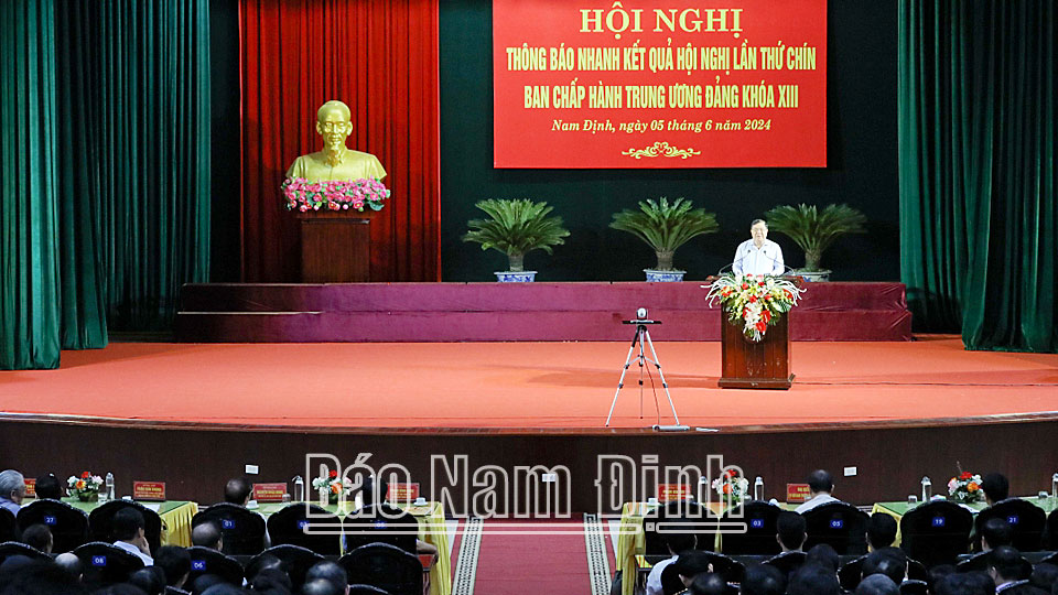 Tại hội nghị, đồng chí Bí thư Tỉnh ủy Phạm Gia Túc thông báo nhanh kết quả Hội nghị lần thứ 9, BCH Trung ương Đảng khoá XIII họp từ ngày 16 đến 18/5/2024 tại Thủ đô Hà Nội. Theo đó, Hội nghị đã thảo luận cho ý kiến vào các nội dung: Đề cương chi tiết Báo cáo chính trị của BCH Trung ương Đảng khóa XIII tại Đại hội đại biểu toàn quốc lần thứ XIV của Đảng; Đề cương chi tiết Báo cáo đánh giá 5 năm thực hiện Chiến lược phát triển kinh tế - xã hội 10 năm (2021-2030), phương hướng, nhiệm vụ phát triển kinh tế - xã hội 5 năm (2026-2030); Đề cương báo cáo của BCH Trung ương Đảng khóa XIII về tổng kết công tác xây dựng Đảng và thi hành điều lệ Đảng trình Đại hội XIV của Đảng. Hội nghị cũng nghe Báo cáo tổng kết Chỉ thị số 35 ngày 30/5/2019 của Bộ Chính trị và Dự thảo Chỉ thị của Bộ Chính trị về đại hội đảng bộ các cấp tiến tới Đại hội XIV của Đảng; Báo cáo những công việc quan trọng Bộ Chính trị đã giải quyết từ sau Hội nghị Trung ương 8 đến Hội nghị Trung ương 9 và một số nhiệm vụ trọng tâm từ Hội nghị Trung ương 9 đến Hội nghị Trung ương 10, khóa XIII; Báo cáo kết quả công tác kiểm tra, giám sát và thi hành kỷ luật Đảng năm 2023, phương hướng, nhiệm vụ năm 2024; Công tác cán bộ và một số vấn đề quan trọng khác… Với tinh thần trách nhiệm cao, các đồng chí Ủy viên BCH Trung ương Đảng đã dành thời gian nghiên cứu, phát biểu, thảo luận đóng góp nhiều ý kiến. BCH Trung ương thống nhất cao các đề cương, dự thảo, văn kiện Đại hội XIV của Đảng, thống nhất cao để thông qua Nghị quyết Hội nghị Trung ương 9, khóa XIII.
