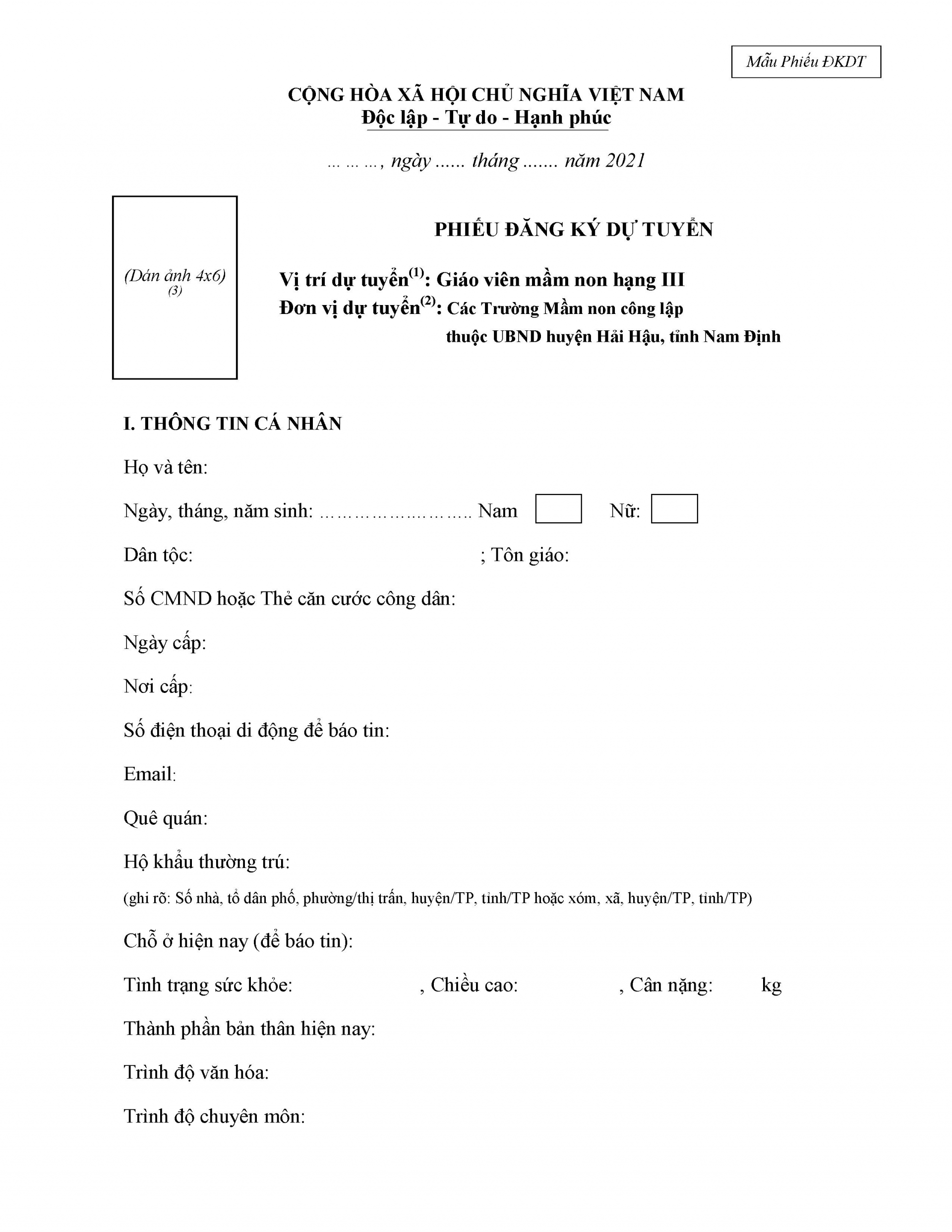 - Qua cổng thông tin điện tử của UBND huyện Hải Hậu tại địa chỉ: http://haihau.namdinh. gov.vn/huyenhaỉhau/1207/26916/49416/Nop-ho-so-truc-tuyen/ (đính kèm Phiếu đăng ký dự tuyển tại mục "File đính kèm")