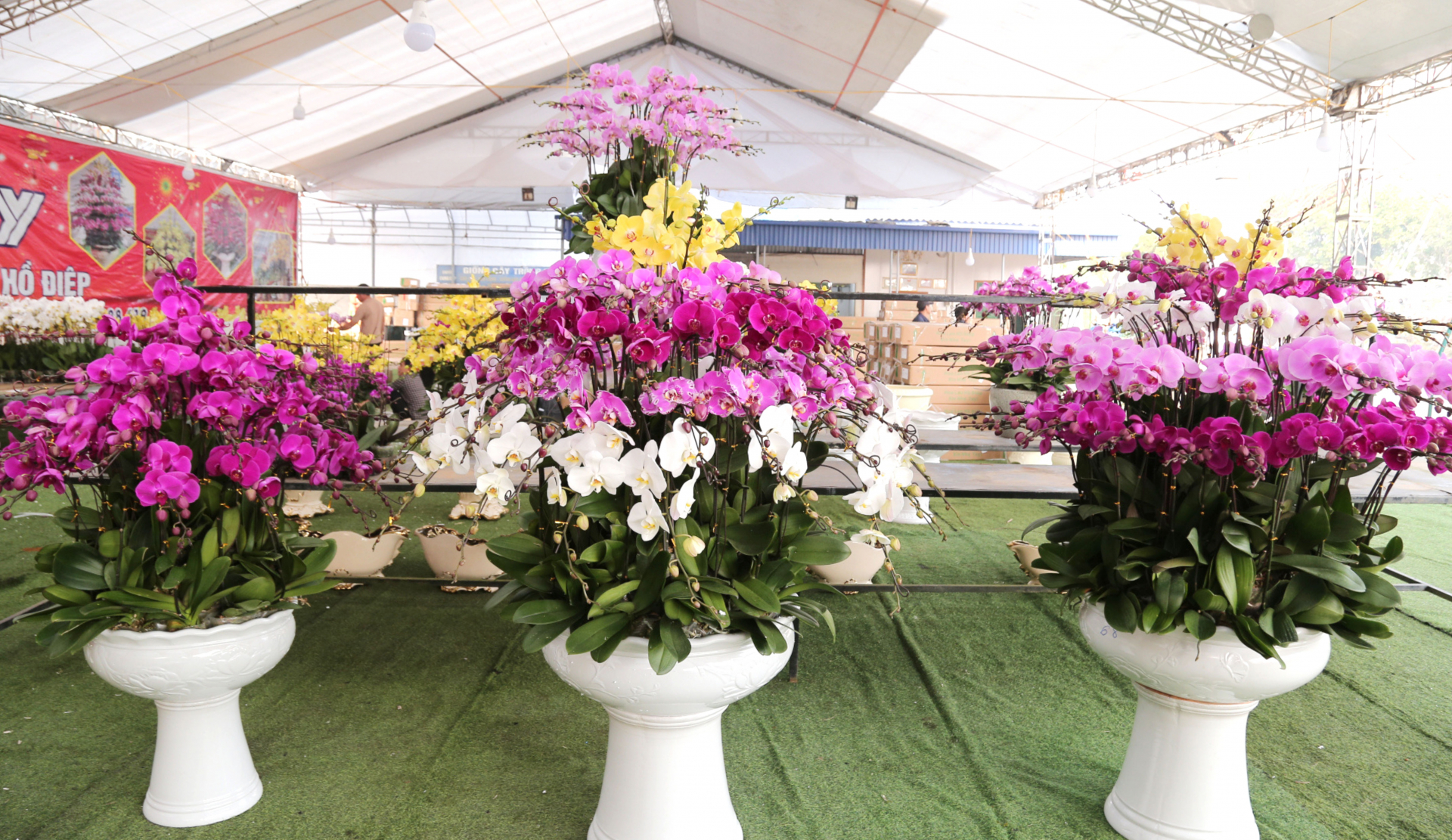 | Lan hồ điệp được các nhà vườn tạo hình cho lên chậu phục vụ nhu cầu khách hàng dịp Tết Nguyên đán. |