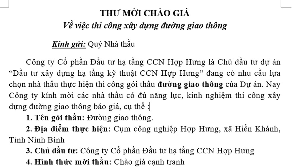 Thư mời chào giá Về việc thi công xây dựng đường giao thông