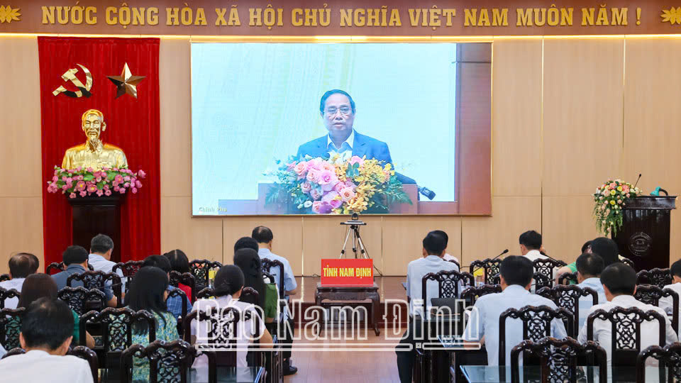 | Các đồng chí: Bí thư Tỉnh ủy Phạm Gia Túc; Chủ tịch UBND tỉnh Phạm Đình Nghị chủ trì hội nghị tại điểm cầu tỉnh Nam Định. |