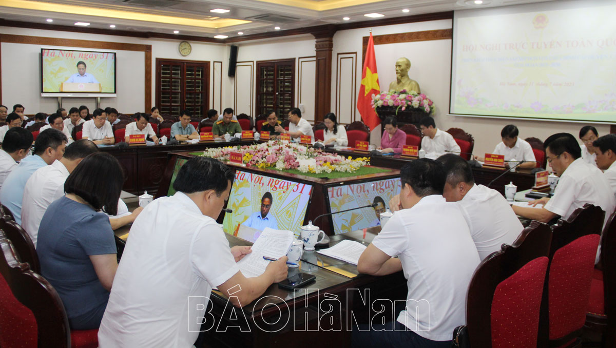 Chủ trì hội nghị tại điểm cầu UBND tỉnh Hà Nam có các đồng chí: Lê Thị Thủy, Ủy viên Trung ương Đảng, Bí thư Tỉnh ủy, Chủ tịch HĐND tỉnh; Đinh Thị Lụa, Phó Bí thư Thường trực Tỉnh ủy; Trương Quốc Huy, Phó Bí thư Tỉnh ủy, Chủ tịch UBND tỉnh, Trưởng đoàn Đại biểu Quốc hội tỉnh; các ủy viên Ban Thường vụ Tỉnh ủy; Thường trực HĐND, lãnh đạo UBND tỉnh; lãnh đạo các sở, ngành của tỉnh; lãnh đạo các huyện, thị xã, thành phố...