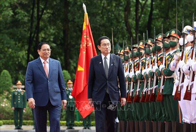 Thủ tướng Phạm Minh Chính mời Thủ tướng Kishida Fumio bước trên thảm đỏ trong tiếng vẫy chào của các em học sinh với cờ hoa rực rỡ trên tay để tới bục danh dự. Quân nhạc cử quốc thiều hai nước. Hai nhà Lãnh đạo cùng bước tới chào Quốc kỳ Việt Nam. Sau đó, Thủ tướng Phạm Minh Chính mời Thủ tướng Nhật Bản duyệt Đội Danh dự Quân đội nhân dân Việt Nam. Thủ tướng Phạm Minh Chính và Thủ tướng Kishida Fumio giới thiệu cho nhau các thành viên Đoàn Cấp cao hai nước dự lễ đón.