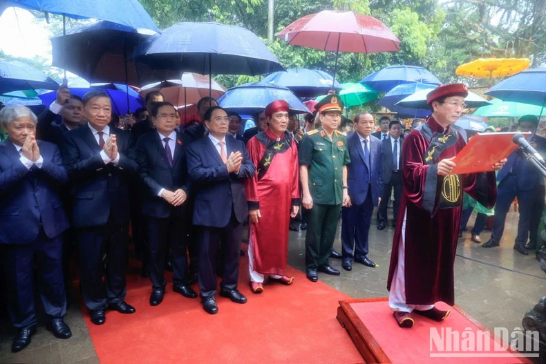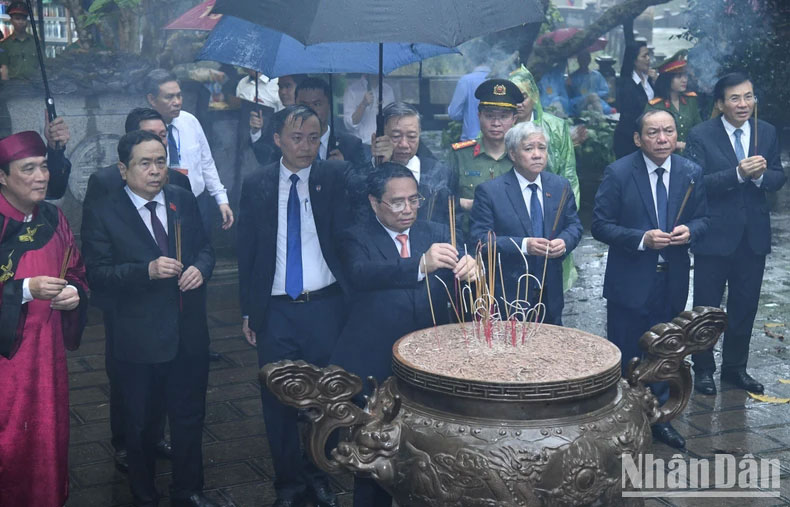 | Thủ tướng Phạm Minh Chính và các đồng chí lãnh đạo thực hiện nghi thức Giỗ Tổ trước Đền Thượng. |