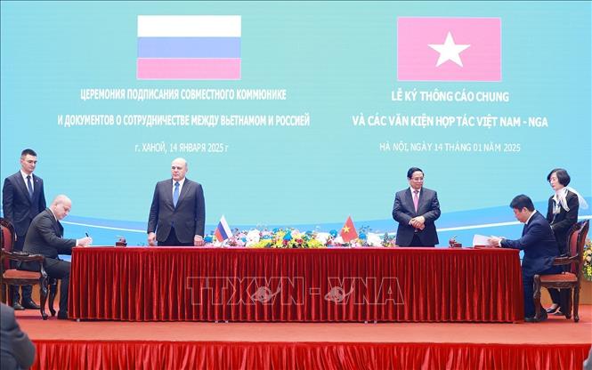 Sau hội đàm, Thủ tướng Chính phủ Phạm Minh Chính và Thủ tướng Chính phủ Mikhail Mishustin đã ký Thông cáo chung về kết quả chuyến thăm chính thức Việt Nam của Thủ tướng Chính phủ Nga và cùng chứng kiến lễ ký kết một số văn kiện hợp tác trong lĩnh vực khoa học, thông tin truyền thông, văn hóa...