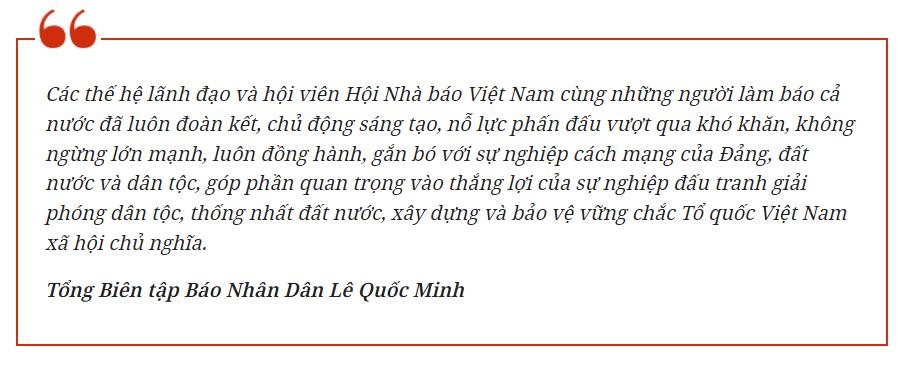 Báo cáo Thủ tướng Chính phủ tại buổi thăm, làm việc, đồng chí Lê Quốc Minh, Ủy viên Trung ương Đảng, Tổng Biên tập Báo Nhân Dân, Phó Trưởng Ban Tuyên giáo Trung ương, Chủ tịch Hội Nhà báo Việt Nam nêu rõ, dưới sự lãnh đạo của Đảng Cộng sản Việt Nam và Chủ tịch Hồ Chí Minh, 73 qua, kể từ ngày thành lập tại chiến khu Việt Bắc trong cuộc kháng chiến chống thực dân Pháp xâm lược (21/4/1950), các thế hệ lãnh đạo và hội viên Hội Nhà báo Việt Nam cùng những người làm báo cả nước đã luôn đoàn kết, chủ động sáng tạo, nỗ lực phấn đấu vượt qua khó khăn, không ngừng lớn mạnh, luôn đồng hành, gắn bó với sự nghiệp cách mạng của Đảng, đất nước và dân tộc, góp phần quan trọng vào thắng lợi của sự nghiệp đấu tranh giải phóng dân tộc, thống nhất đất nước, xây dựng và bảo vệ vững chắc Tổ quốc Việt Nam xã hội chủ nghĩa.