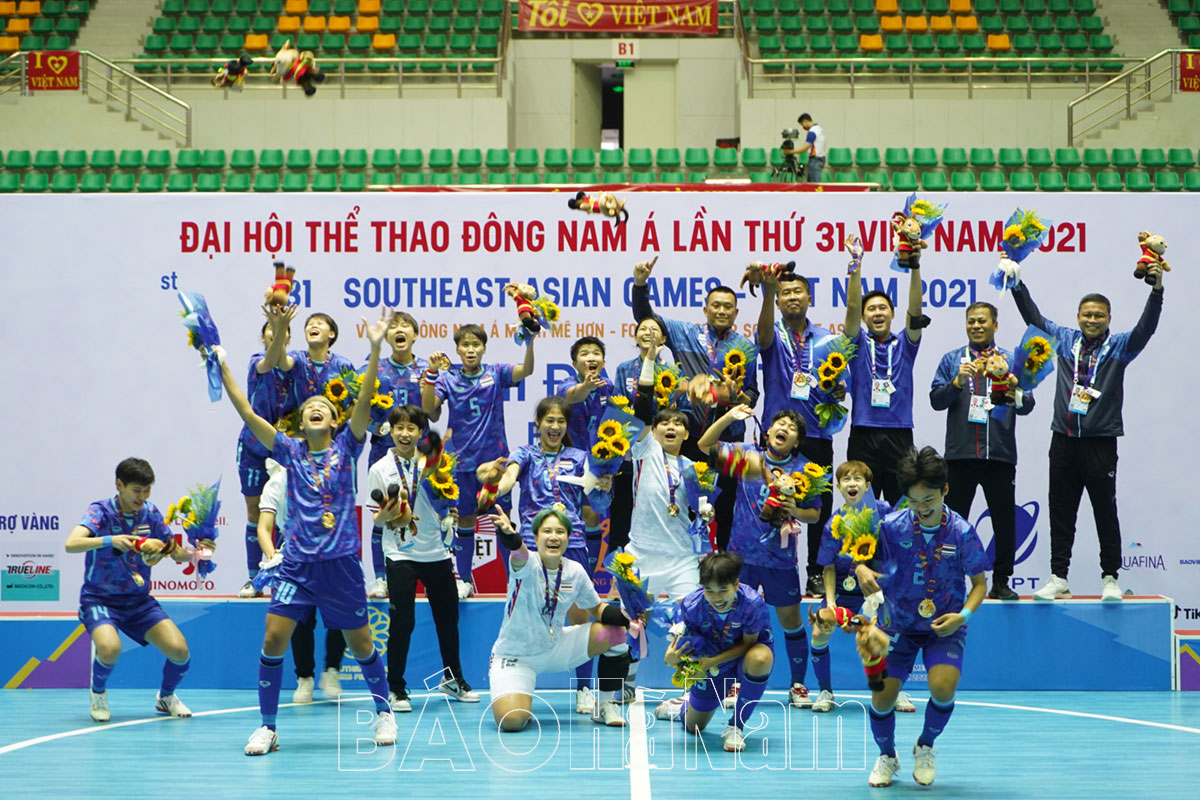 Các đồng chí lãnh đạo tỉnh trao Huy chương Bạc cho ĐT futsal nữ Việt Nam.Các cầu thủ ĐT futsal nữ Thái Lan ăn mừng chiến thắng.