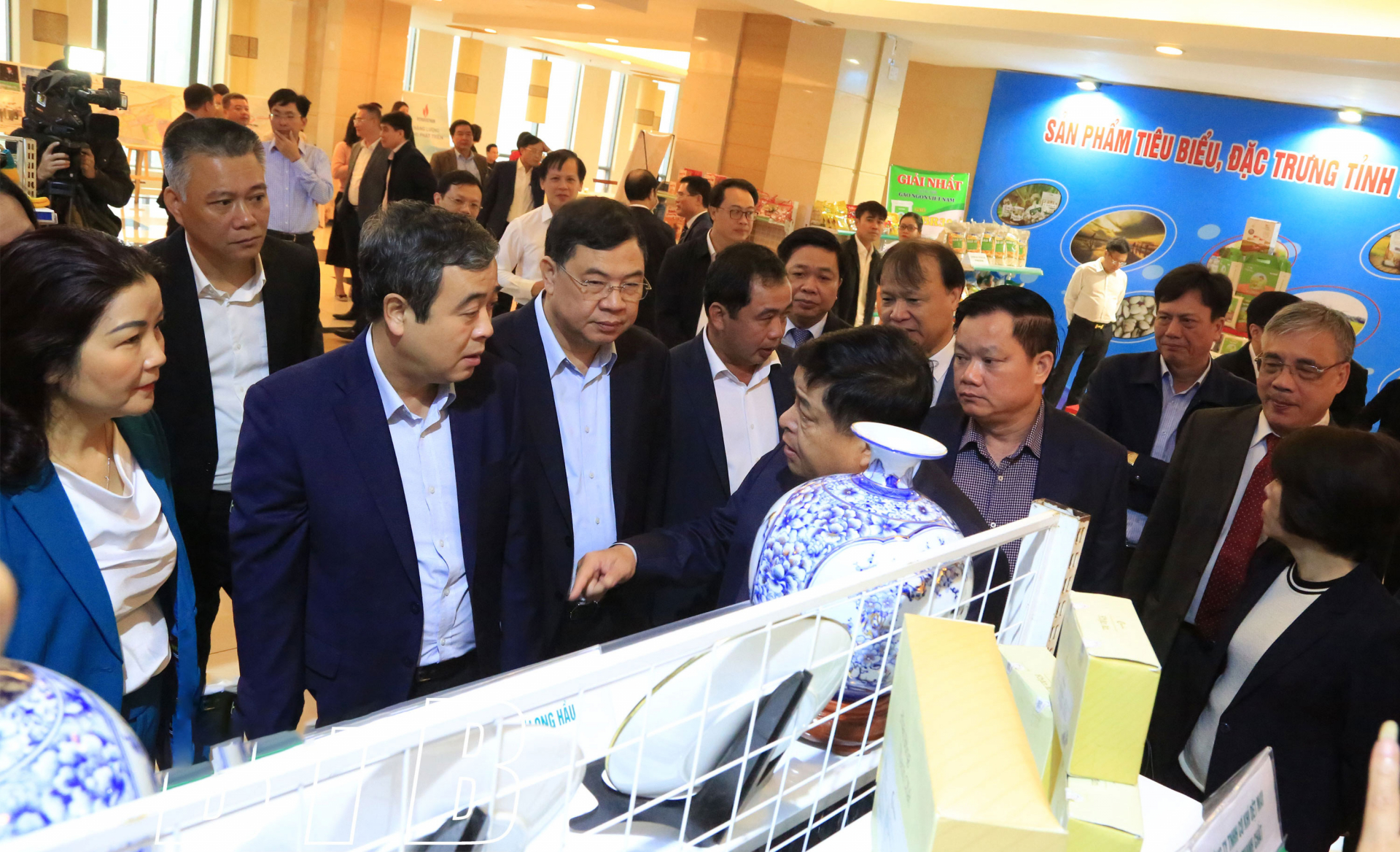 | Các đồng chí lãnh đạo tham quan gian trưng bày sản phẩm tại hội thảo. |