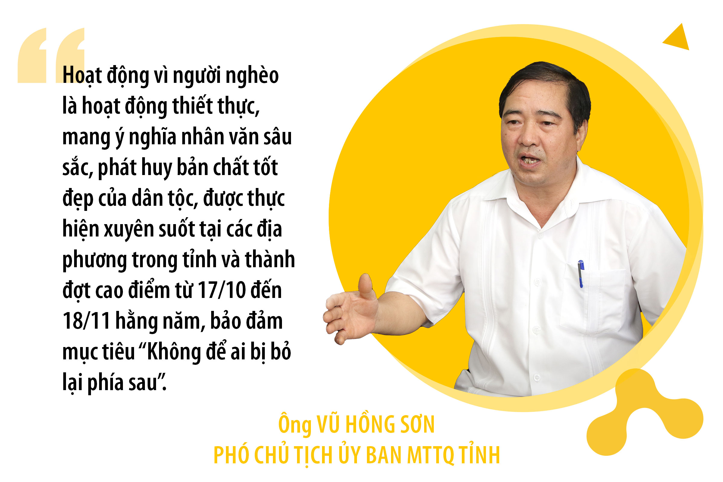 Bên cạnh đó, tiếp tục phát huy truyền thống đoàn kết, tương thân, tương ái của các tầng lớp nhân dân, các tổ chức, doanh nghiệp, nhà hảo tâm và toàn xã hội cùng chăm lo, giúp đỡ người nghèo cải thiện cuộc sống. Các hoạt động có sự phối hợp thống nhất giữa Ủy ban MTTQ tỉnh, Ban vận động Quỹ “Vì người nghèo” tỉnh với các ban, ngành, tổ chức thành viên của MTTQ để tránh chồng chéo trong công tác vận động và triển khai hỗ trợ cho hộ nghèo.