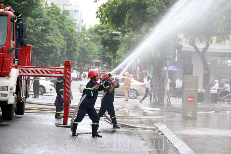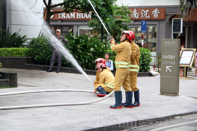 Sáng 1/8, Phòng Phòng Cảnh sát Phòng cháy, chữa cháy và cứu nạn, cứu hộ (PCCC và CNCH) Công an tỉnh phối hợp với Khách sạn Vicom Plaza Phủ Lý (Melia Vinpearl Phủ Lý) tổ chức thực tập phương án chữa cháy, CNCH cơ sở.