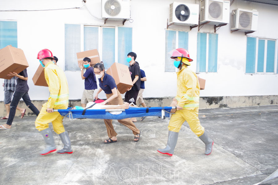 Lực lượng PCCC cở sở cùng công nhân thực hành di chuyển người và tài sản ra khỏi đám cháy.