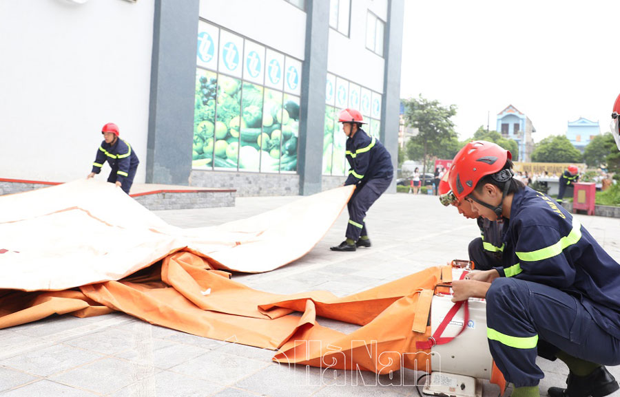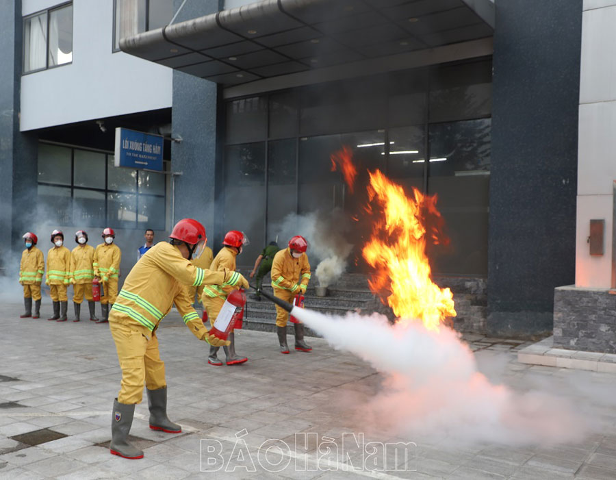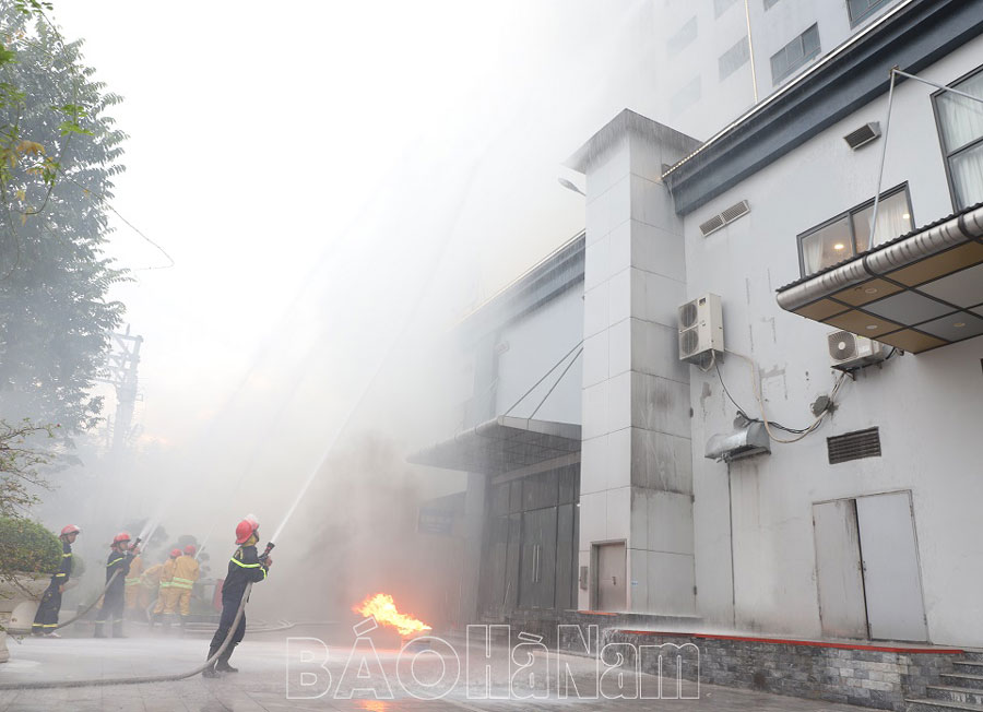 Tình huống giả định, vào hồi 16 giờ 30 phút, ngày 18/10/2023, tại Khu vực hầm để xe toà nhà Chung cư Tiến Lộc, do sự cố chập điện ắc quy 01 xe máy trong hầm để xe, gây cháy và lan sang các vật dụng khác. Khói, khí độc và lửa đã lan nhanh toàn bộ khu vực nhà để xe, có xu hướng lan lên trên khu vực nhà hàng và chung cư. Thời điểm xảy ra cháy, số người có mặt ở chung cư tập trung đông, xuất hiện tình trạng hỗn loạn, mắc kẹt trên các tầng của toà nhà. Phát hiện cháy, 01 nhân viên đang thường trực tại khu vực để xe của toà nhà đã hô hoán, ấn chuông báo cháy; phối hợp Đội PCCC cơ sở sử dụng bình chữa cháy tại chỗ phun vào đám cháy, thông báo toàn bộ người trong toà nhà thoát nạn qua đường cầu thang bộ; đồng thời gọi điện báo cho Phòng Cảnh sát PCCC&CNCH qua số máy 114 và lãnh đạo Công ty, Công an thành phố Phủ Lý, Công an phường Thanh Châu để huy động lực lượng đảm bảo an ninh trật tự và giao thông.
