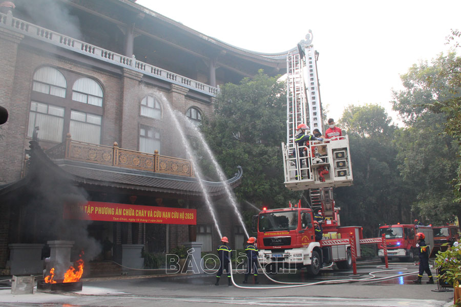 Chiều 16/1, Phòng Cảnh sát Phòng cháy, chữa cháy và Cứu nạn, cứu hộ (PCCC và CNCH), Công an tỉnh phối hợp với Công ty TNHH Dịch vụ du lịch Chân Tâm tổ chức thực tập phương án chữa cháy của cơ quan Công an tại Khu du lịch Tam Chúc, phường Ba Sao, thị xã Kim Bảng.