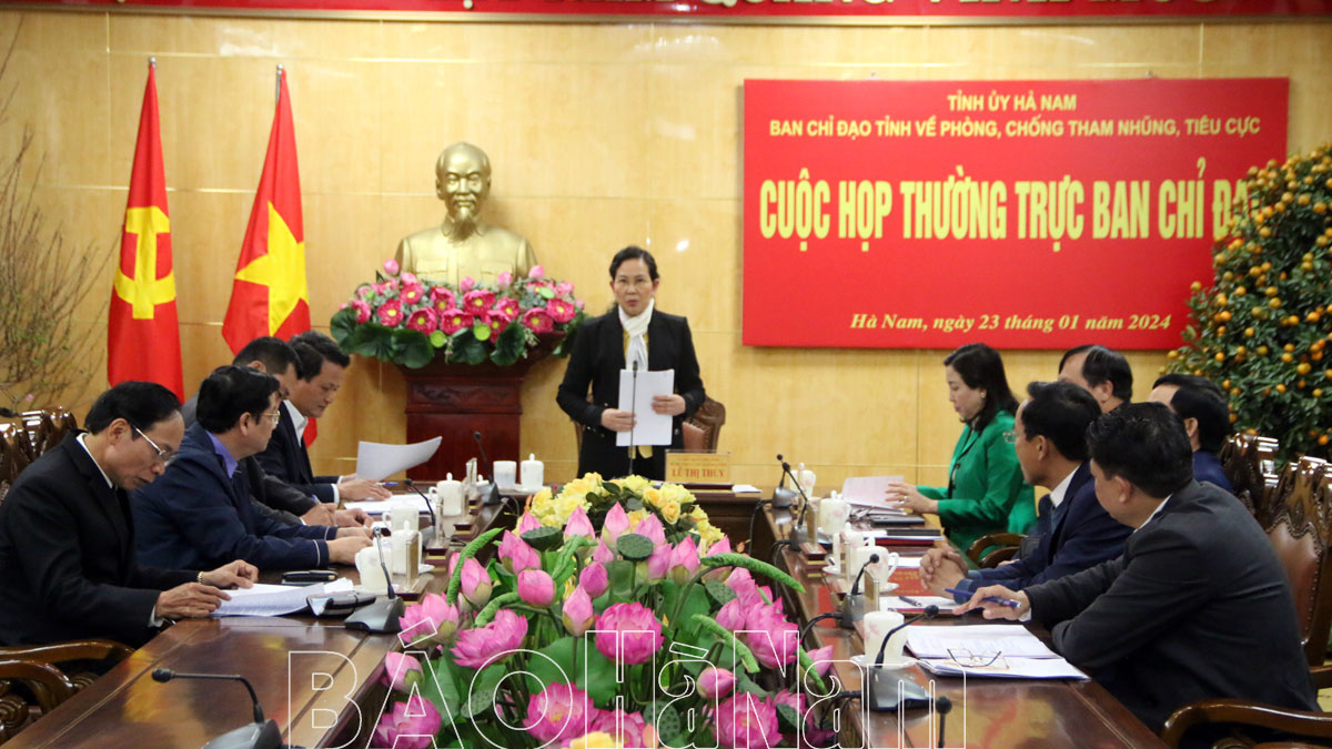 Chiều 23/1, Thường trực Ban Chỉ đạo (BCĐ) tỉnh về phòng chống tham nhũng, tiêu cực (PCTN,TC) tổ chức phiên họp đánh giá kết quả thực hiện công tác PCTN, TC thời gian qua, triển khai một số nhiệm vụ trọng tâm thời gian tới. Đồng chí Lê Thị Thủy, Ủy viên Trung ương Đảng, Bí thư Tỉnh ủy, Chủ tịch HĐND tỉnh, Trưởng BCĐ tỉnh về PCTN, TC chủ trì hội nghị. Dự phiên họp có đồng chí Đinh Thị Lụa, Phó Bí thư Thường trực Tỉnh ủy, Phó BCĐ tỉnh về PCTN, TC; các đồng chí Thường trực BCĐ và một số thành viên BCĐ tỉnh về PCTN, TC.
