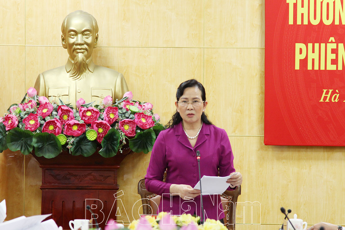 Phát biểu kết luận phiên họp, đồng chí Lê Thị Thủy, Ủy viên Trung ương Đảng, Bí thư Tỉnh ủy, Chủ tịch HĐND tỉnh đề nghị: UBND tỉnh quyết liệt thực hiện các giải pháp nhằm hoàn thành thắng lợi các chỉ tiêu, nhiệm vụ KT-XH của năm, nhất là kế hoạch giải ngân vốn đầu tư công năm 2022. Thường trực HĐND, các ban, các tổ đại biểu, đại biểu HĐND tỉnh, thường trực HĐND các huyện, thị xã, thành phố trong phạm vi quyền hạn, chức năng của mình tăng cường giám sát các hoạt động chuyên môn, đảm bảo đúng theo quy định; bám sát đời sống của nhân dân, tập trung giải quyết triệt để các ý kiến, kiến nghị, phản ánh của cử tri và nhân dân. Các cấp, các ngành cần tập trung tháo gỡ những vướng mắc về cơ chế, chính sách phục vụ cho nhiệm vụ phát triển KT-XH; tăng cường phòng, chống các loại dịch bệnh cho nhân dân, khắc phục tình trạng thiếu thuốc, vật tư y tế tại các cơ sở y tế; chú trọng giải ngân vốn đầu tư công, nhất là các dự án của trung ương trên địa bàn tỉnh để tận dụng nguồn vốn; quan tâm cấp giấy chứng nhận quyền sử dụng đất cho người dân, xử lý hiệu quả vấn đề ô nhiễm môi trường, nhất là ô nhiễm khu vực Tây Đáy, khu vực nông thôn...
