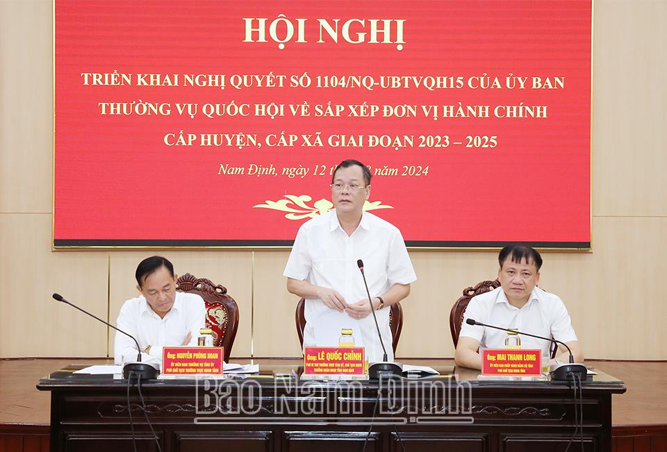 Chiều 12/8, Thường trực HĐND tỉnh tổ chức hội nghị triển khai Nghị quyết số 1104/NQ-UBTVQH15 ngày 23/7/2024 của Ủy Ban Thường vụ Quốc hội về sắp xếp đơn vị hành chính (ĐVHC) cấp huyện, cấp xã giai đoạn 2023-2025 tỉnh Nam Định. Các đồng chí: Lê Quốc Chỉnh, Phó Bí thư Thường trực Tỉnh ủy, Chủ tịch HĐND tỉnh, Trưởng đoàn Đoàn đại biểu Quốc hội tỉnh; Nguyễn Phùng Hoan, Ủy viên Ban TVTU, Phó Chủ tịch Thường trực HĐND tỉnh; Mai Thanh Long, TUV, Phó Chủ tịch HĐND tỉnh chủ trì hội nghị. Tham dự hội nghị có lãnh đạo Ban Tổ chức Tỉnh ủy, Sở Nội vụ, các Ban của HĐND tỉnh, Văn phòng Đoàn ĐBQH và HĐND tỉnh; HĐND các huyện, thành phố Nam Định.