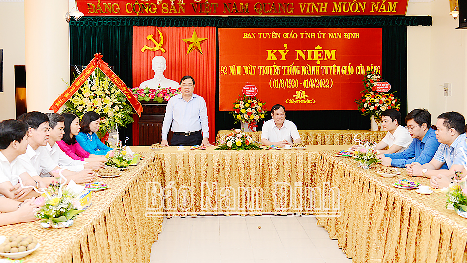 Thay mặt Thường trực, Ban TVTU, đồng chí Bí thư Tỉnh ủy đã chúc mừng ngành Tuyên giáo nhân Ngày truyền thống đồng thời khẳng định, trong những tháng đầu năm 2022 tỉnh ta đã đạt được nhiều kết quả toàn diện trên các lĩnh vực công tác xây dựng Đảng, phát triển kinh tế - xã hội, bảo đảm quốc phòng - an ninh. Trong sự phát triển chung của tỉnh có sự đóng góp tích cực của ngành Tuyên giáo. Đặc biệt, Ban Tuyên giáo Tỉnh ủy đã tham mưu giúp Thường trực, Ban TVTU lãnh đạo, chỉ đạo tổ chức tốt việc học tập, quán triệt, triển khai thực hiện các chỉ thị, nghị quyết của Đảng; phát huy vai trò xung kích trên mặt trận tư tưởng, văn hóa của Đảng; đẩy mạnh tuyên truyền tạo sự đồng thuận trong xã hội khi tỉnh triển khai, xây dựng nhiều dự án trọng điểm, tạo đà cho sự phát triển bền vững của tỉnh. Đồng chí Bí thư Tỉnh ủy mong rằng, thời gian tới ngành Tuyên giáo tiếp tục phát huy truyền thống; chủ động bám sát nhiệm vụ chính trị và định hướng chỉ đạo của cấp ủy các cấp; tiếp tục tham mưu đổi mới công tác quán triệt, tuyên truyền, triển khai thực hiện các chỉ thị, nghị quyết của Đảng; đẩy mạnh công tác tuyên truyền các sự kiện quan trọng của quê hương, đất nước và các nhiệm vụ chính trị của địa phương.
