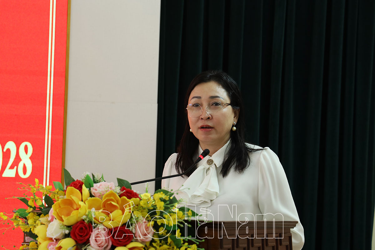 Đồng chí Phó Bí thư Thường trực Tỉnh ủy Đinh Thị Lụa phát biểu tại buổi gặp mặt.