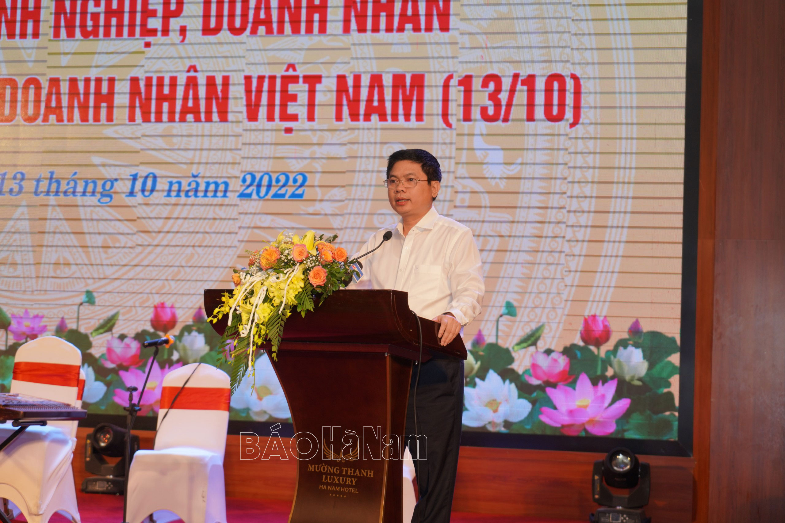 Phát biểu tại buổi gặp mặt, đồng chí Chủ tịch UBND tỉnh Trương Quốc Huy gửi lời chúc mừng đến các doanh nhân, doanh nghiệp nhân Ngày Doanh nhân Việt Nam. Đồng chí Chủ tịch UBND tỉnh nhấn mạnh: Trong 9 tháng đầu năm 2022, tình hình kinh tế - xã hội của tỉnh đạt được kết quả tích cực, toàn diện trên các lĩnh vực. Tổng sản phẩm trong tỉnh đạt 31.113 tỷ đồng, tăng 9,0% so với cùng kỳ. Giá trị sản xuất công nghiệp ước đạt 122.149 tỷ đồng, tăng 14,5%, đạt 70,1% kế hoạch; tốc độ tăng trưởng các sản phẩm công nghiệp chủ yếu của tỉnh có mức tăng cao. Thu hút đầu tư tiếp tục được quan tâm và đạt những kết quả tốt; tỉnh đã tổ chức thành công Đoàn công tác xúc tiến đầu tư của tỉnh tại Nhật Bản, Hàn Quốc. Thu cân đối ngân sách Nhà nước 9 tháng ước đạt 9.478,7 tỷ đồng, bằng 96,0% so với cùng kỳ, đạt 77% dự toán Trung ương giao, 76% dự toán địa phương phấn đấu. Đạt được kết quả này, có sự đóng góp quan trọng của cộng đồng doanh nghiệp, doanh nhân trong tỉnh.