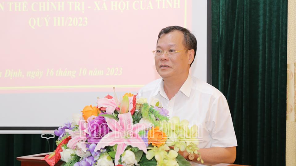 Phát biểu chỉ đạo tại hội nghị, đồng chí Phó Bí thư Thường trực Tỉnh ủy Lê Quốc Chỉnh đánh giá cao những kết quả đạt được của MTTQ và các đoàn thể chính trị - xã hội trong quý III năm 2023 và nhấn mạnh: Quý IV năm 2023, MTTQ và các đoàn thể chính trị - xã hội tỉnh tiếp tục tuyên truyền, quán triệt và triển khai tổ chức thực hiện có hiệu quả các chủ trương của Đảng, chính sách pháp luật của Nhà nước, đặc biệt là các nghị quyết, chỉ thị, kết luận của Đảng, chỉ đạo của tỉnh đối với công tác dân vận, MTTQ và các đoàn thể chính trị - xã hội. Phối hợp chặt chẽ với các ban, ngành, đoàn thể và chính quyền địa phương nắm bắt, phản ảnh kịp thời tình hình dư luận xã hội, tâm tư, nguyện vọng của cán bộ, đoàn viên, hội viên và nhân dân trên địa bàn tỉnh trong việc triển khai sắp xếp đơn vị hành chính cấp huyện, xã giai đoạn 2023-2030 trên địa bàn tỉnh. Đẩy mạnh công tác vận động đoàn viên, hội viên và người dân để tạo sự đồng thuận trong công tác giải phóng mặt bằng các dự án trọng điểm trên địa bàn tỉnh, đặc biệt là dự án của Tập đoàn Xuân Thiện tại khu vực Cồn Xanh (Nghĩa Hưng). Nâng cao chất lượng các cuộc vận động, phong trào thi đua yêu nước, tập trung vào phong trào thi đua “Nam Định chung sức xây dựng nông thôn mới nâng cao, kiểu mẫu” giai đoạn 2021-2025, góp phần hoàn thành các mục tiêu, chỉ tiêu kinh tế - xã hội của tỉnh. Đồng chí đề nghị Ban Dân vận Tỉnh ủy tổng hợp, nắm bắt tình hình hoạt động của MTTQ và các đoàn thể, báo cáo Thường trực Tỉnh ủy trong hội nghị giao ban để giải quyết kịp thời những khó khăn vướng mắc trong triển khai thực hiện nhiệm vụ./.