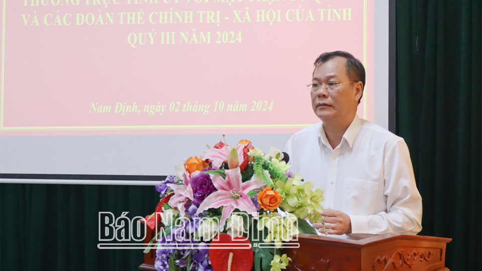 Phát biểu kết luận hội nghị, đồng chí Phó Bí thư Thường trực Tỉnh ủy Lê Quốc Chỉnh ghi nhận, đánh giá cao những kết quả đạt được của MTTQ và các đoàn thể chính trị - xã hội tỉnh trong quý III năm 2024. Đồng chí đề nghị thời gian tới, MTTQ và các đoàn thể cần tiếp tục quán triệt, triển khai thực hiện có hiệu quả các chủ trương, đường lối của Đảng, chính sách, pháp luật của Nhà nước, nhất là các nghị quyết, chỉ thị, kết luận của Đảng, chỉ đạo của tỉnh đối với công tác dân vận, MTTQ và các đoàn thể chính trị - xã hội; đặc biệt tập trung đẩy mạnh tuyên truyền đại hội đảng bộ các cấp nhiệm kỳ 2025-2030, tiến tới Đại hội Đảng bộ tỉnh lần thứ XXI. Thường xuyên nắm bắt tình hình, tâm tư, nguyện vọng của nhân dân, nhất là việc thực hiện chính sách xã hội, phát triển kinh tế, giải phóng mặt bằng; kịp thời tham mưu giải quyết các vấn đề, kiến nghị chính đáng của nhân dân với cấp ủy, chính quyền. Đẩy mạnh công tác tuyên truyền, vận động các tầng lớp nhân dân, tạo đồng thuận xã hội trong thực hiện các cuộc vận động, phong trào thi đua yêu nước, tích cực tham gia thực hiện phát triển kinh tế - xã hội; trong đó tập trung thực hiện hiệu quả các nhiệm vụ cụ thể trong công tác giải phóng mặt bằng triển khai các dự án, công trình trọng điểm, xây dựng NTM nâng cao, kiểu mẫu. Tiếp tục nhân rộng, duy trì hoạt động bền vững của các mô hình phát triển kinh tế, giữ gìn an ninh trật tự, xây dựng đời sống văn hóa, vệ sinh môi trường, an toàn giao thông; xây dựng các chương trình an sinh xã hội, nhất là các hoạt động chăm lo dịp Tết Nguyên đán Ất Tỵ 2025. Tăng cường các hoạt động phối hợp tập huấn, nâng cao trình độ đội ngũ cán bộ cơ sở. Chú trọng làm tốt công tác giải quyết chế độ chính sách cho các đồng chí dôi dư sau sắp xếp, sáp nhập đơn vị hành chính. Hoàn thành chương trình giám sát của MTTQ và các đoàn thể chính trị - xã hội, nâng cao chất lượng công tác giám sát, phản biện xã hội; tham gia góp ý xây dựng Đảng, chính quyền trong sạch, vững mạnh./.