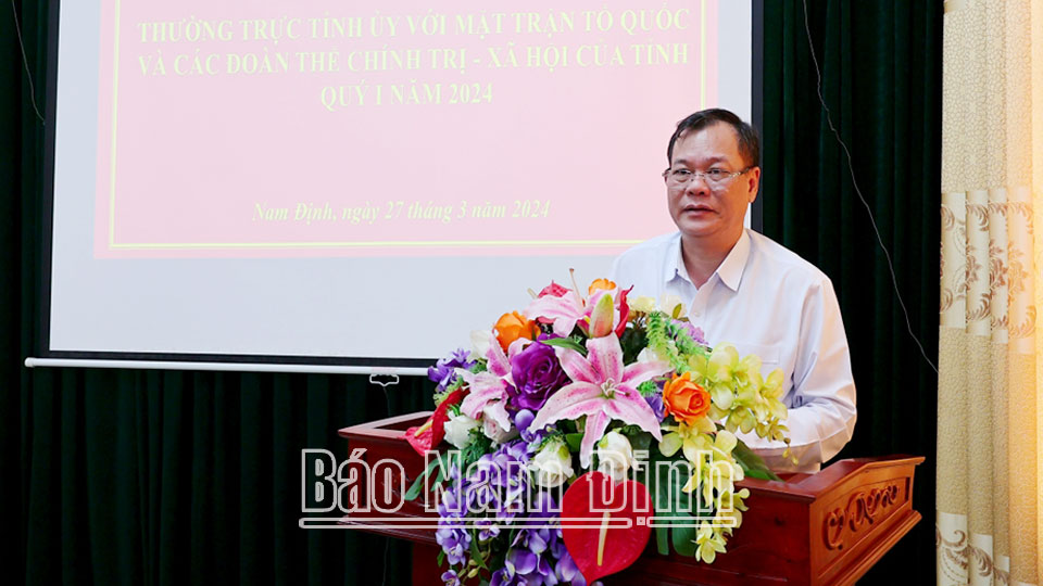 Trong quý I năm 2024, MTTQ và các đoàn thể chính trị - xã hội tỉnh luôn bám sát sự lãnh đạo của Thường trực Tỉnh ủy, Ban TVTU và hướng dẫn, chỉ đạo của Trung ương; thường xuyên đẩy mạnh công tác tuyên truyền, vận động hội viên, đoàn viên và các tầng lớp nhân dân thực hiện tốt các chủ trương, đường lối của Đảng, chính sách, pháp luật của Nhà nước; tích cực tham gia các cuộc vận động, phong trào thi đua yêu nước gắn với thực hiện nhiệm vụ chính trị của tỉnh. Trong đó, Ủy ban MTTQ tỉnh tập trung chỉ đạo hoàn thành Đại hội MTTQ cấp xã ở 150/226 xã, phường, thị trấn; chỉ đạo MTTQ huyện Xuân Trường chuẩn bị tổ chức Đại hội điểm cấp huyện; phấn đấu hoàn thành Đại hội đại biểu MTTQ cấp huyện trong tháng 6-2024; phối hợp với Liên hiệp các tổ chức hữu nghị tỉnh tổ chức gặp mặt kiều bào là những người con quê hương Nam Định dịp Tết Nguyên đán. Liên đoàn Lao động tỉnh chỉ đạo các cấp Công đoàn nắm bắt tình hình quan hệ lao động và kết quả tổ chức các hoạt động chăm lo cho đoàn viên, người lao động trước, trong và sau Tết Nguyên đán Giáp Thìn 2024; hướng dẫn, đôn đốc tổ chức hội nghị cán bộ, công chức, viên chức, hội nghị người lao động năm 2024 tại các cơ quan, đơn vị, doanh nghiệp trên địa bàn tỉnh… Hội Nông dân tỉnh phối hợp tham mưu Ban TVTU xây dựng Chương trình hành động thực hiện Nghị quyết 46-NQ/TW, ngày 20-12-2023 của Bộ Chính trị về đổi mới, nâng cao chất lượng hoạt động của Hội Nông dân Việt Nam đáp ứng yêu cầu nhiệm vụ cách mạng trong giai đoạn mới… Hội Liên hiệp Phụ nữ tỉnh tổ chức nhiều hoạt động sôi nổi như: Diễn đàn “Xây dựng người phụ nữ Việt Nam thời đại mới”, chương trình “Mẹ đỡ đầu”, phối hợp tổ chức khóa học “Phụ nữ tự tin làm kinh tế” cho cán bộ chuyên trách, bán chuyên trách, hội viên phụ nữ... Hội Cựu chiến binh tỉnh phối hợp với các cơ quan chức năng tham mưu cho cấp ủy, chính quyền địa phương nắm chắc tình hình; tích cực tham gia thực hiện nhiệm vụ giữ gìn an ninh chính trị, trật tự, an toàn xã hội; phòng, chống tội phạm, tệ nạn xã hội, góp phần giữ vững ổn định chính trị từ cơ sở… Đoàn Thanh niên Cộng sản Hồ Chí Minh tỉnh triển khai Cuộc vận động “Tự hào một dải non sông” do Trung ương Đoàn phát động; chỉ đạo các cấp bộ Đoàn tăng cường vận động, kết nối các nguồn lực, đội hình thanh niên tham gia thực hiện các mô hình, hoạt động hiệu quả nhằm xây dựng nông thôn mới nâng cao, kiểu mẫu…
